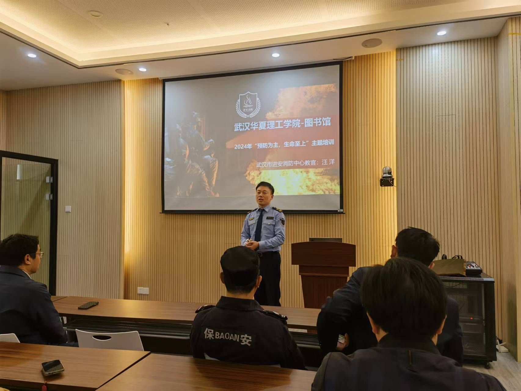 3月29日下午,党委保卫工作部邀请武汉市进安消防中心汪洋教官来校开展消防知识讲座,进行疏散逃生和灭火实操演练活动,图书馆工作人员和安保队员参加学习和培训。