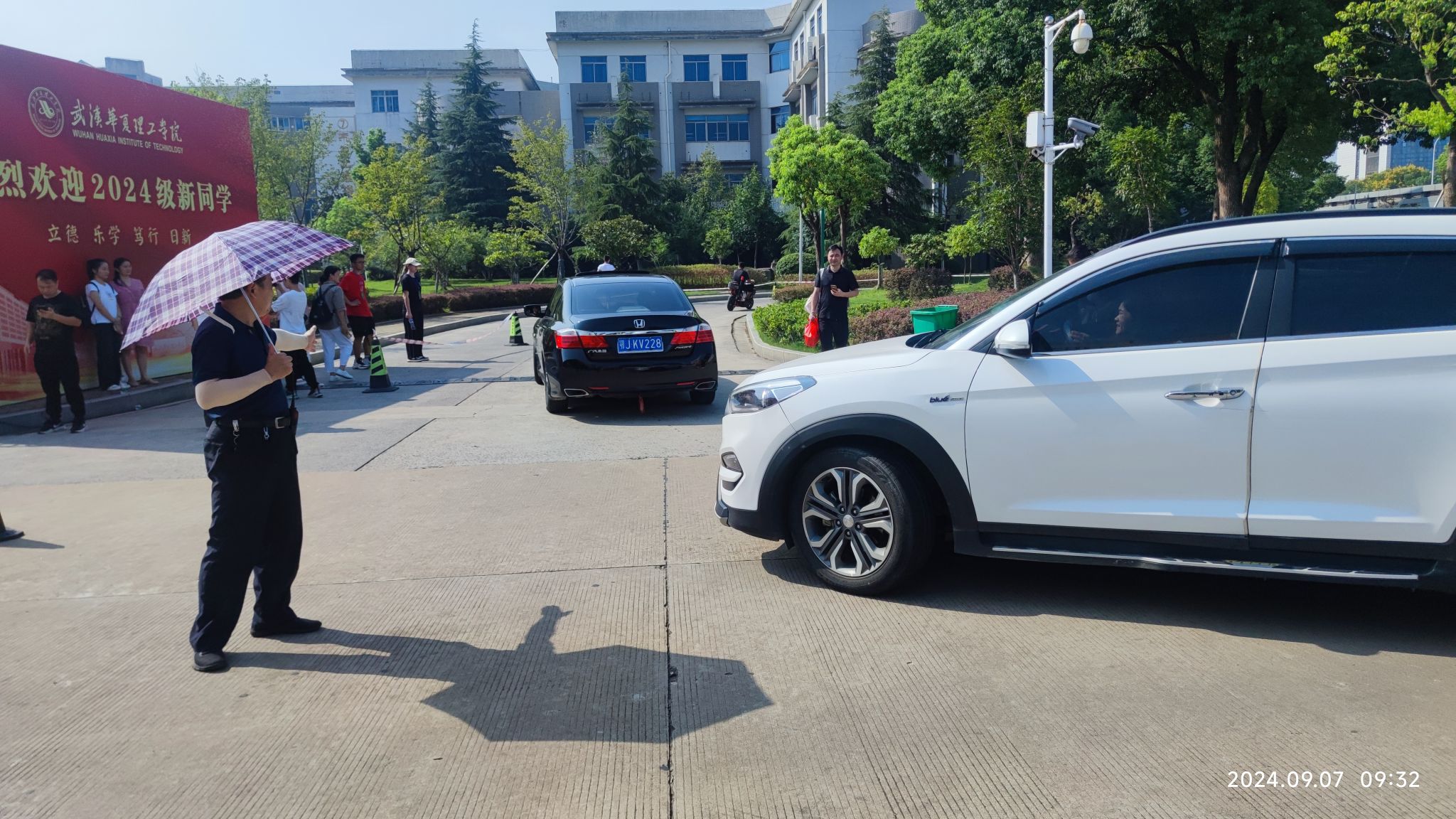 迎新当日,由于到校新生及家长数量多、车流量大,叠加考试车流、人流,校内道路交通压力骤增。保卫部邀请东湖高新区交警大队民警协助做好学校周边道路疏导工作,全力保障来校人员入校顺利。保卫部今年新开辟后门篮球场作为宿舍区域主停车场,这一举措极大缓解了校内交通压力,据统计,两天新生报到车辆、考生车辆共有5638辆车进入校园,其中7日入校3483辆,8日入校2155辆。