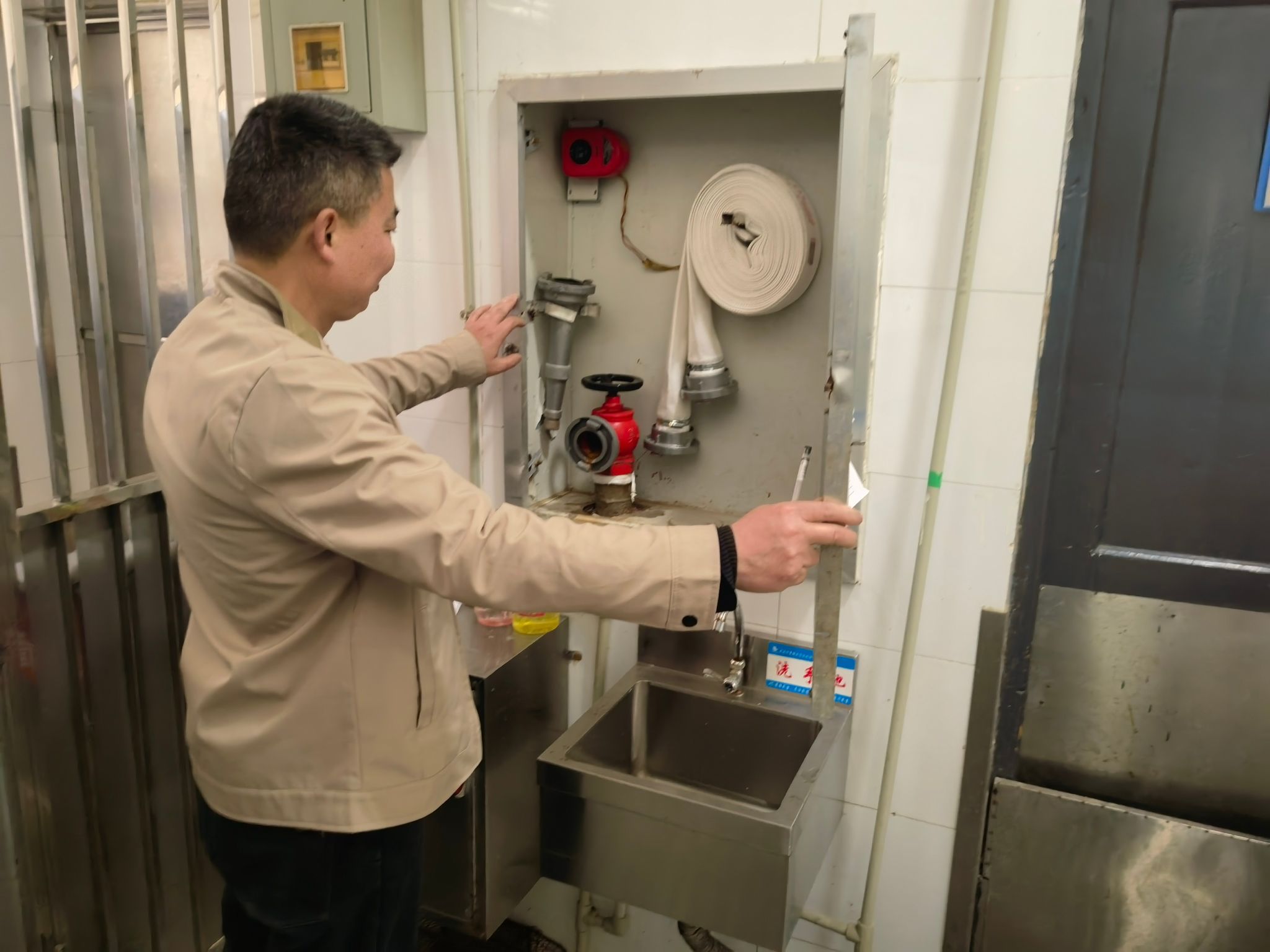 随后,对食堂和博学路美食街的消防设施进行了细致的检查。检查人员仔细检查了消防设施的完备性,涵盖了灭火器、消防火栓以及烟雾报警器等,确保它们处于最佳状态。对于检查中发现的问题,现场提出了整改建议,并要求各负责人严格执行安全隐患整改措施,加强日常安全检查,确保消防安全。