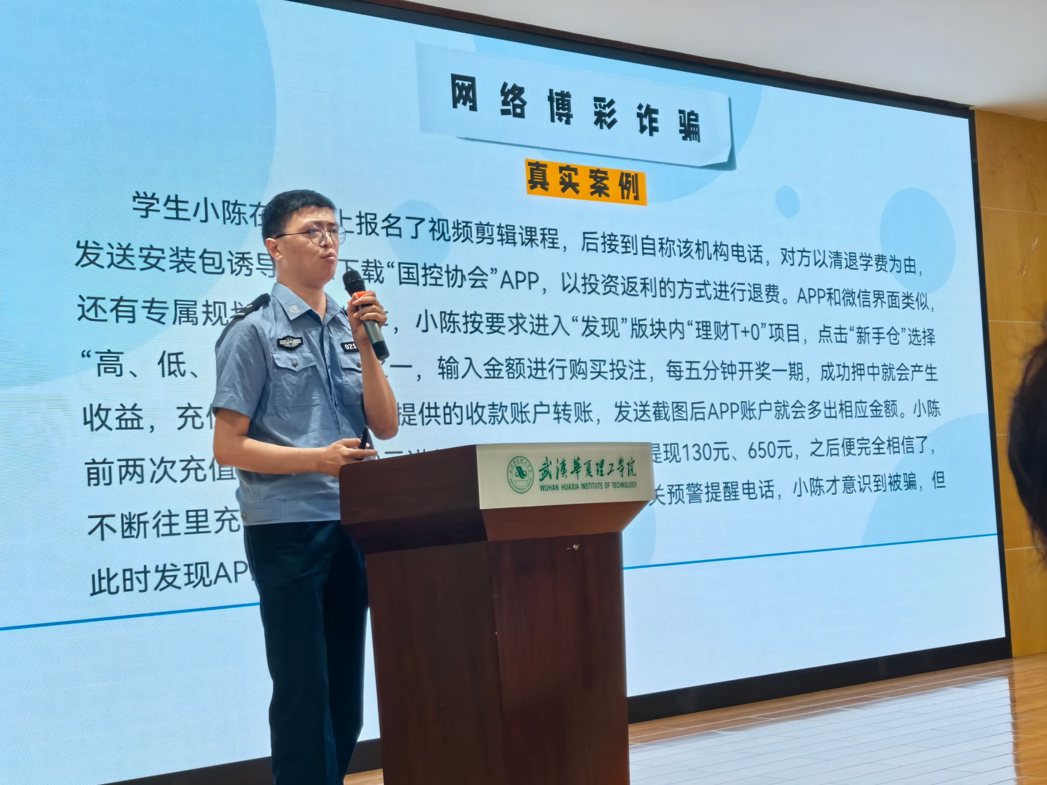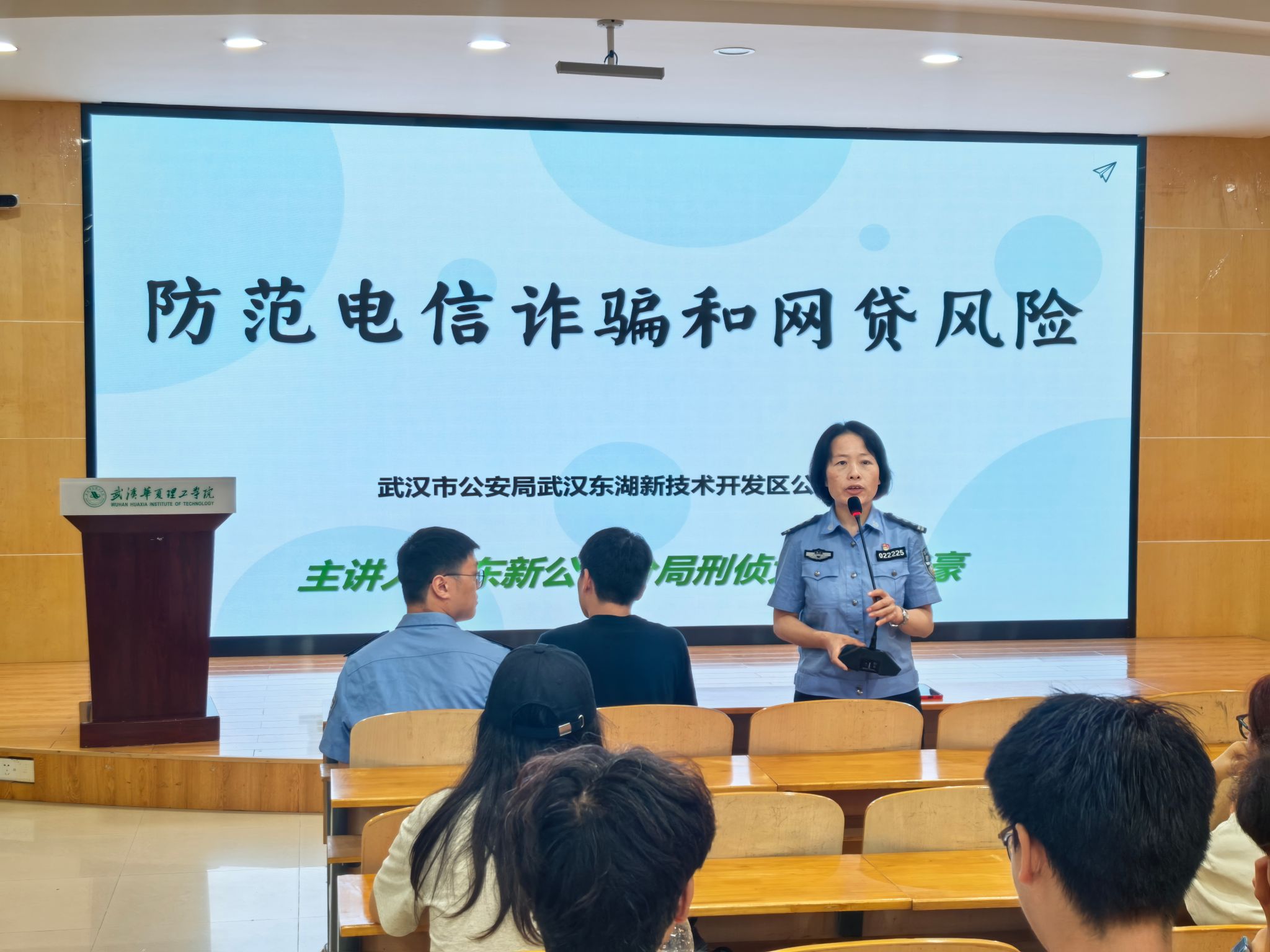 为了进一步提升在校师生对电信网络诈骗的识别、防范和抵制能力,有效预防和减少此类案件的发生,确保师生财产安全,5月28日晚上18点30分,保卫部特别邀请了关南派出所副所长黄惠芬、东湖高新区公安分局刑侦大队张书豪警官,在2教201多媒体教室开展防范电信诈骗和网贷风险专题讲座。