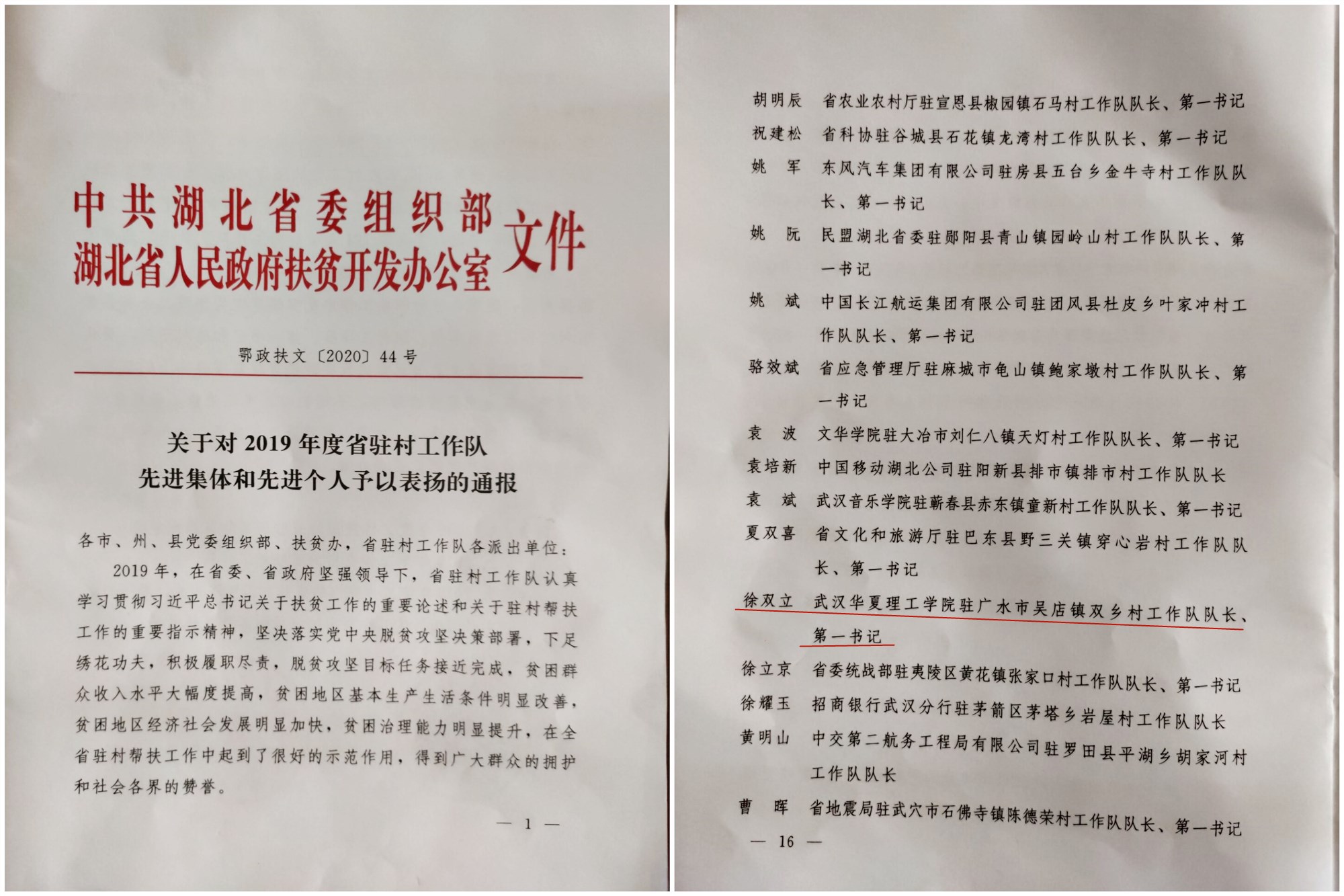 近日,从省委组织部、省人民政府扶贫办传来好消息,2019年省驻村工作队先进集体和先进个人评选结果揭晓,beat365党建工作部徐双立同志获评2019年度工作突出的省驻村工作队队长、第一书记。