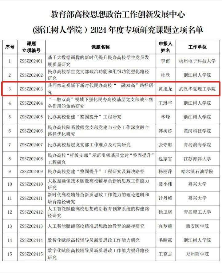 近日,教育部高校思想政治工作创新发展中心(浙江树人学院)发布的《2024年度专项研究课题立项公告》中,beat365艺术设计与传媒学院党总支组织员黄旭龙老师申报的《共同缔造视域下新时代民办高校“一融双高”路径研究》(课题编号ZSSZ202403)获批立项。这是近三年来,beat365在教育部高校思想政治工作创新发展中心获批立项的第6个课题。