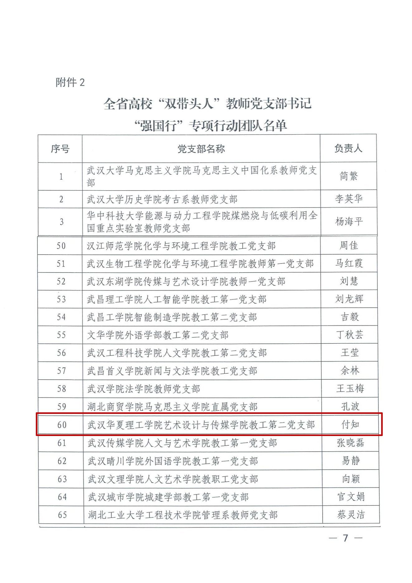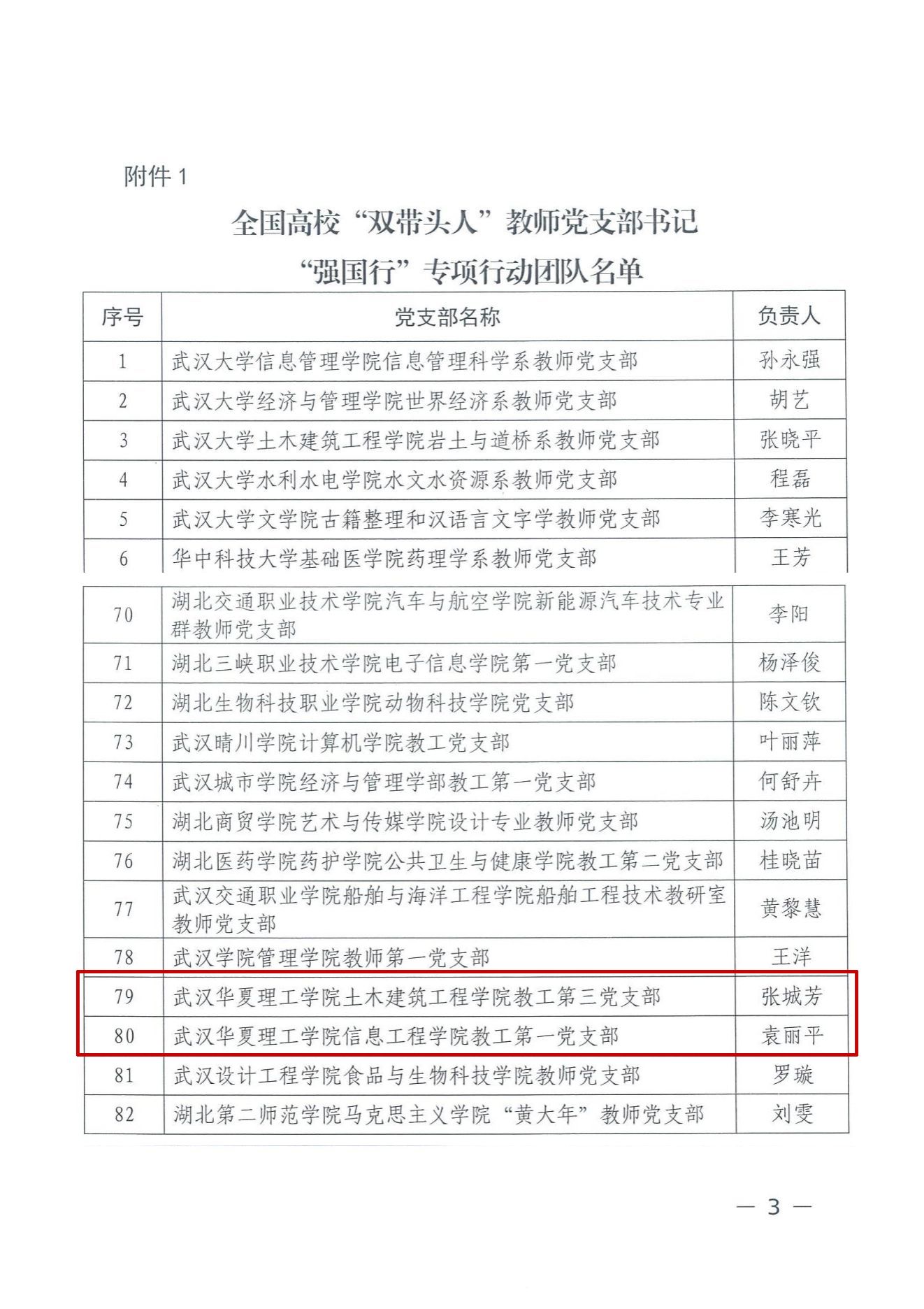 近日,教育部办公厅公布了全国高校“双带头人”教师党支部书记“强国行”专项行动团队名单,beat365土木建筑工程学院教工第三党支部、信息工程学院教工第一党支部2个“双带头人”教师党支部成功入选。艺术设计与传媒学院教工第二党支部也入选全省高校“双带头人”教师党支部书记“强国行”专项行动团队。这是我校在基层党组织建设的一次新突破,也是学校以高质量党建引领高质量发展的重要成果。