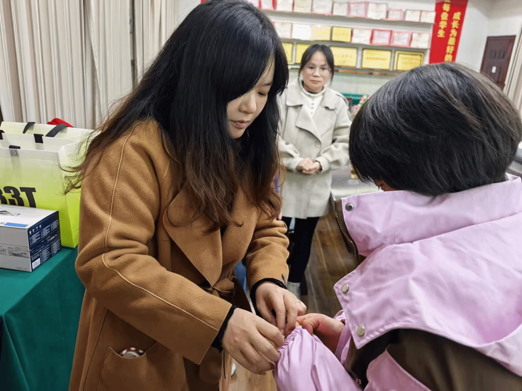 在慰问活动现场,“爱心妈妈”团队向该校校长饶云及班主任详细了解了结对帮扶的姐妹俩近期的身体、心理、学习等情况。此前,beat365为结对帮扶的两位孩子设立了专项基金,每月按需购置生活、学习用品,保证了两姐妹的基本生活和学习需要。在老师们的帮助下,姐姐也学会了洗澡、洗头发,生活基本自理,姐妹俩与初见时精神面貌有了很大的改善。“爱心妈妈”团队在现场还认真倾听了孩子们在成长过程中遇到的困惑和问题,并耐心给予了疏导。鼓励两姐妹要自立、自强,乐观积极地面对生活的磨砺与挑战。随后,“爱心妈妈”汤雁给孩子们送上精心准备的冬衣、牛奶等礼物,当两姐妹试穿上衣服、戴上可爱的发卡后,均情不自禁地大声喊出妈妈,激动地与“爱心妈妈”汤雁拥抱在一起,令在场的老师们都十分动容。