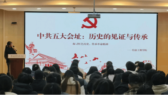 信息工程学院党员服务站宣讲人曾子闻围绕中共五大会址进行宣讲。她通过中共五大会址纪念馆参观视频为大家展示了中共五大会址重要的历史意义。中共五大会址不仅是红色精神的象征,还承载着中国共产党早期革命活动的珍贵记忆,是连接过去与未来的桥梁。她希望通过对中共五大会址的讲解,让学生党员们铭记历史,传承先辈们的革命精神。