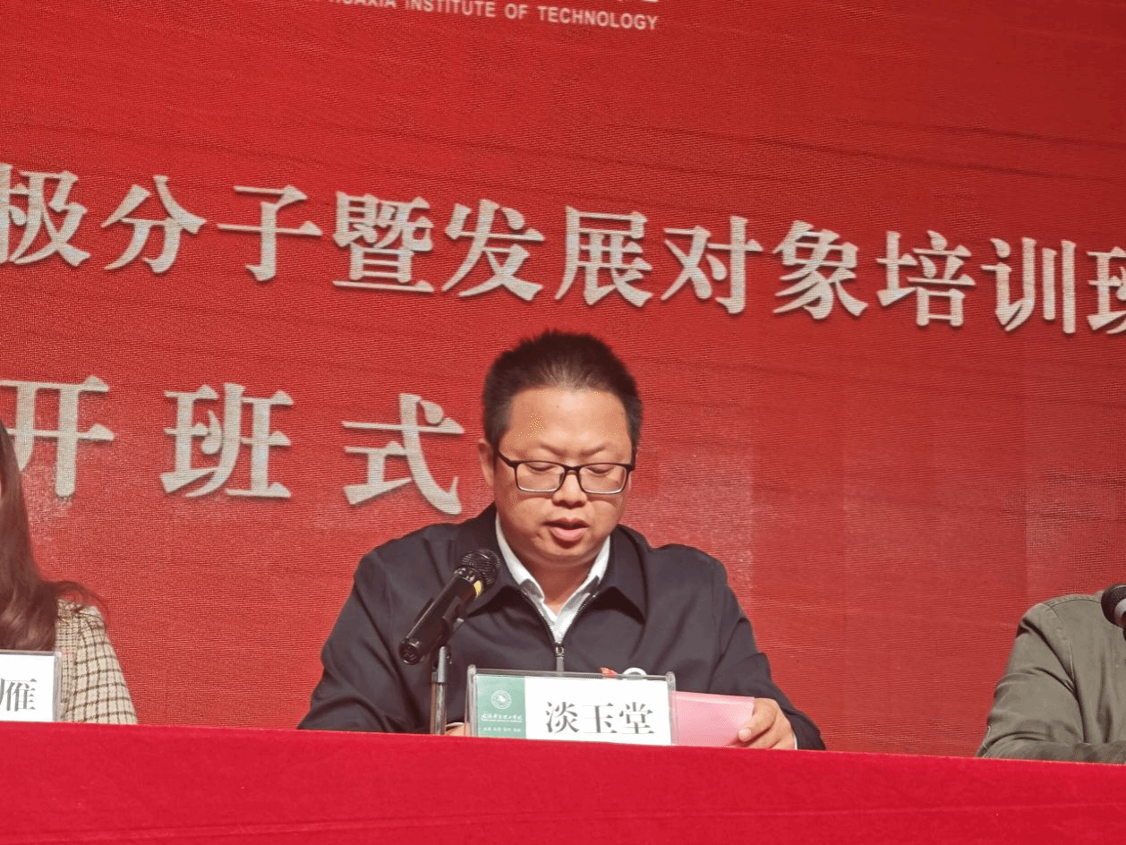 淡玉堂同志作开班讲话。他以“奋斗”为核心,向学员们分享了三个关键词:以“闯”的劲头深耕理论与学业;以“干”的作风投身实践服务;以“拼”的姿态坚守成长征程。他指出,要把理想信念坚定、学习成绩好、综合素质高、奉献精神强,真正具备会思考、会学习、会沟通、会动手、会生活“五会”核心素养和健全人格的优秀大学生吸纳到党的队伍中来。他强调,全体学员要以这次培训为起点,把对党的忠诚、对理想的追求,融入每一次课堂学习、每一次实践服务、每一次拼搏坚守中,要在评估期间带好头、做好榜样,让青春在学校迎评工作和全面建设社会主义现代化国家的火热实践中绽放绚丽之花!