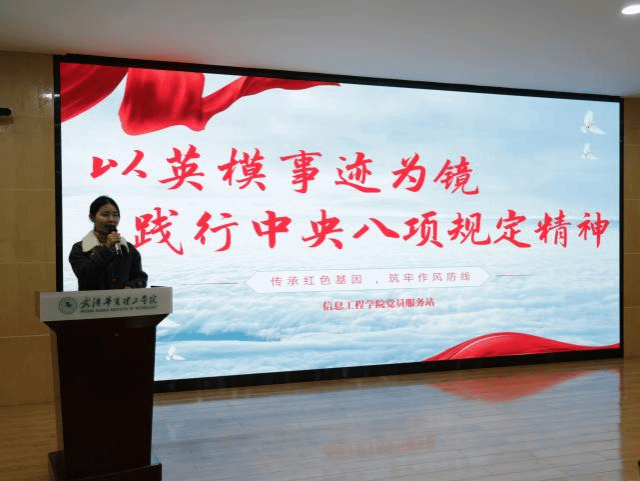 宣讲会在庄严的国歌中拉开序幕。商学院党员代表循着红色足迹讲述贺龙军部旧址纪念馆的峥嵘往事,以贺龙元帅“油条整风,屋檐宿营”的为民初心为引,回溯红安先烈舍身为民的赤诚岁月,让中央八项规定精神“密切联系群众”的核心要义在历史回响中愈发清晰;信息工程学院党员代表聚焦林祥谦、胡玉玲、萧楚女等革命英模的英勇事迹,从他们坚守真理、舍生取义的壮举中,诠释中央八项规定精神反对“四风”、求真务实的本质要求;生物与制药工程学院代表则通过展示青年党员实践动员成果,直观呈现对中央八项规定精神的自觉践行,同时以八七会议“扭转危局、求真务实”的革命精神、辛亥首义“振兴中华、不畏强权”的爱国情怀为依托,深入阐释作风建设的时代内核,让中央八项规定精神愈发具象可感、直抵人心。