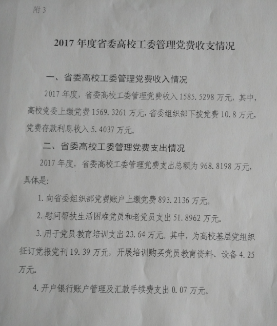 根据《中共湖北省委高校工委关于公示2017年度中央组织部代中央管理党费收支情况、省委组织部代省委管理党费收支情况和省委高校工委管理党费收支情况的通知》,现将2017年度中管党费收支情况、2017省管党费收支情况和2017年度省委高校工委管理党费收支情况转发给你们,请你们认真听取意见建议,于2018年11月28日17:00将意见建议汇总后交党政办公室。