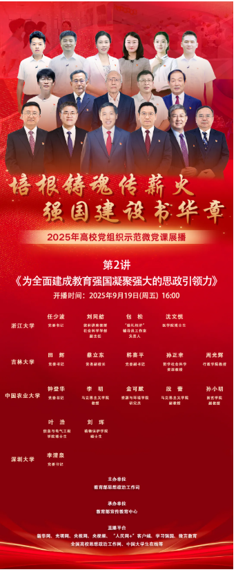为学习把握高校应如何常态长效深化落实中央八项规定精神,切实以优良作风正校风、强教风、优学风,着力推动校风清朗、教风清正、学风清新,凝聚起加快建设世界一流大学的磅礴力量,为推进强国建设、民族复兴伟业作出新贡献。由教育部思想政治工作司主办,教育部宣传教育中心承办,新华网、光明网、央视频等14家媒体联合播放的“培根铸魂传薪火,强国建设书华章”高校党组织示范微党课第二阶段第2期即将播出。本期微党课由浙江大学、吉林大学、中国农业大学、深圳大学4所高校的校领导、知名学者、师生党员代表共同讲授。现将有关事项通知如下: