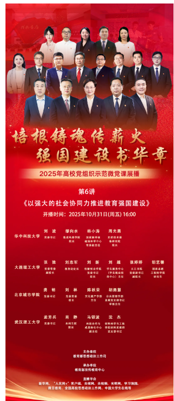 为推进强国建设、民族复兴伟业作出新贡献,由教育部思想政治工作司主办,教育部宣传教育中心承办,新华网、光明网、央视频等14家媒体联合播放的“培根铸魂传薪火,强国建设书华章”高校党组织示范微党课走进2025年高校党组织示范微党课第6讲《以强大的社会协同力推进教育强国建设》即将播出。本期微党课由华中科技大学、大连理工大学、北京城市学院、武汉理工大学4所高校的校领导、知名学者、师生党员代表共同讲授。现将有关事项通知如下: