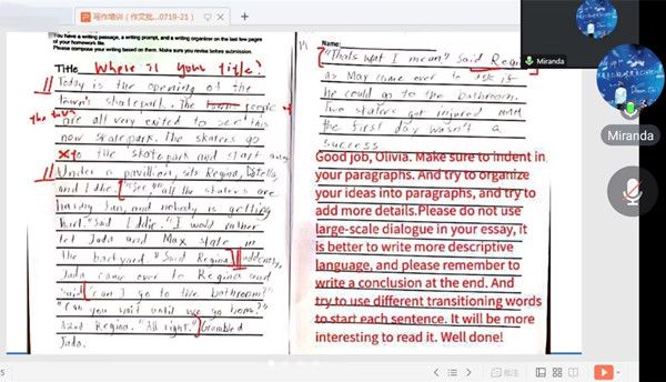 首先,刘潇就上一期美国小学生作文批阅会议内容进行总结。接着,通过展示成员批阅后的作文,刘潇针对性地指出了批改作文中出现的一些问题,比如:评语表达不具体、评语内容及摆放位置等,并进行了相应的详细指导。