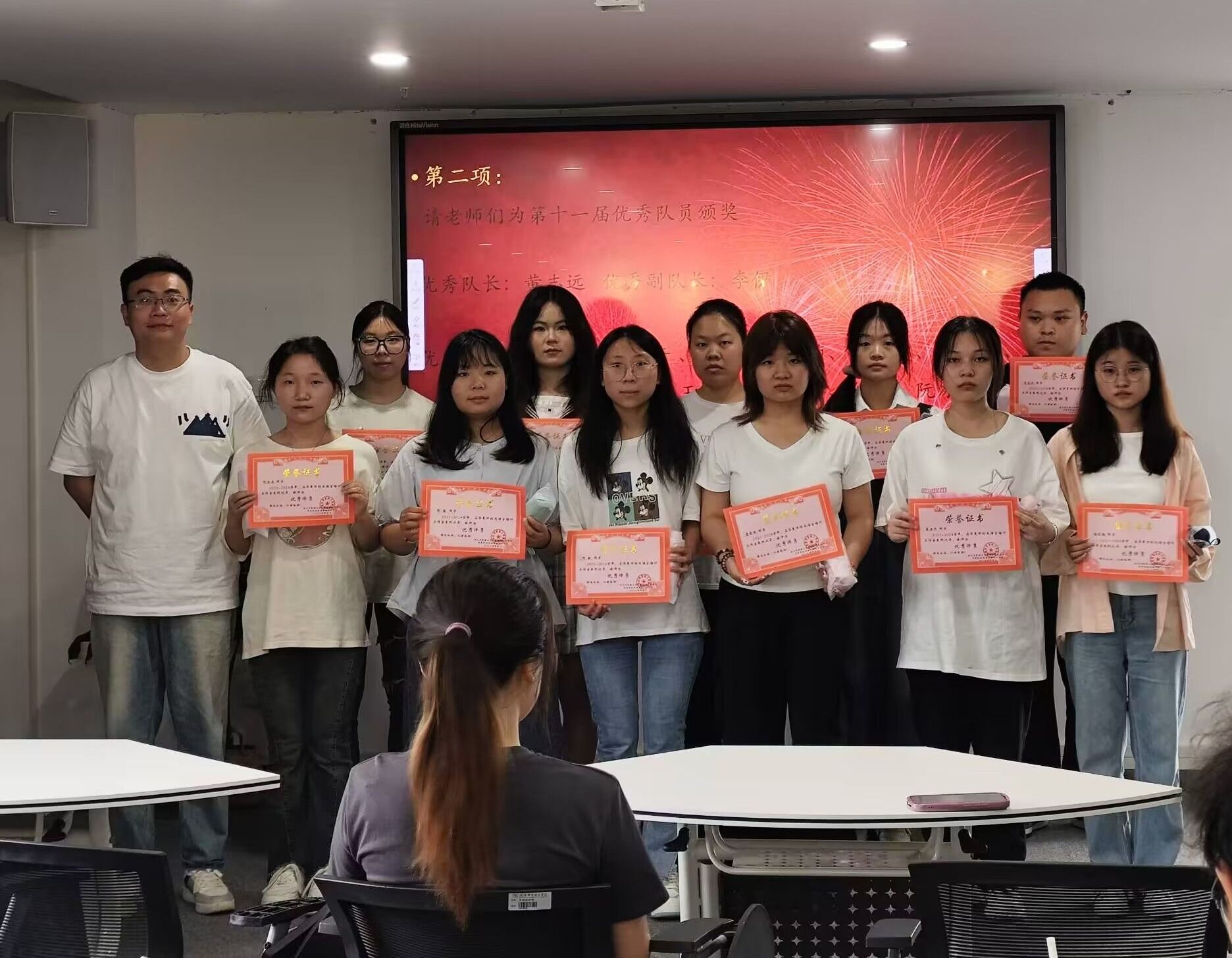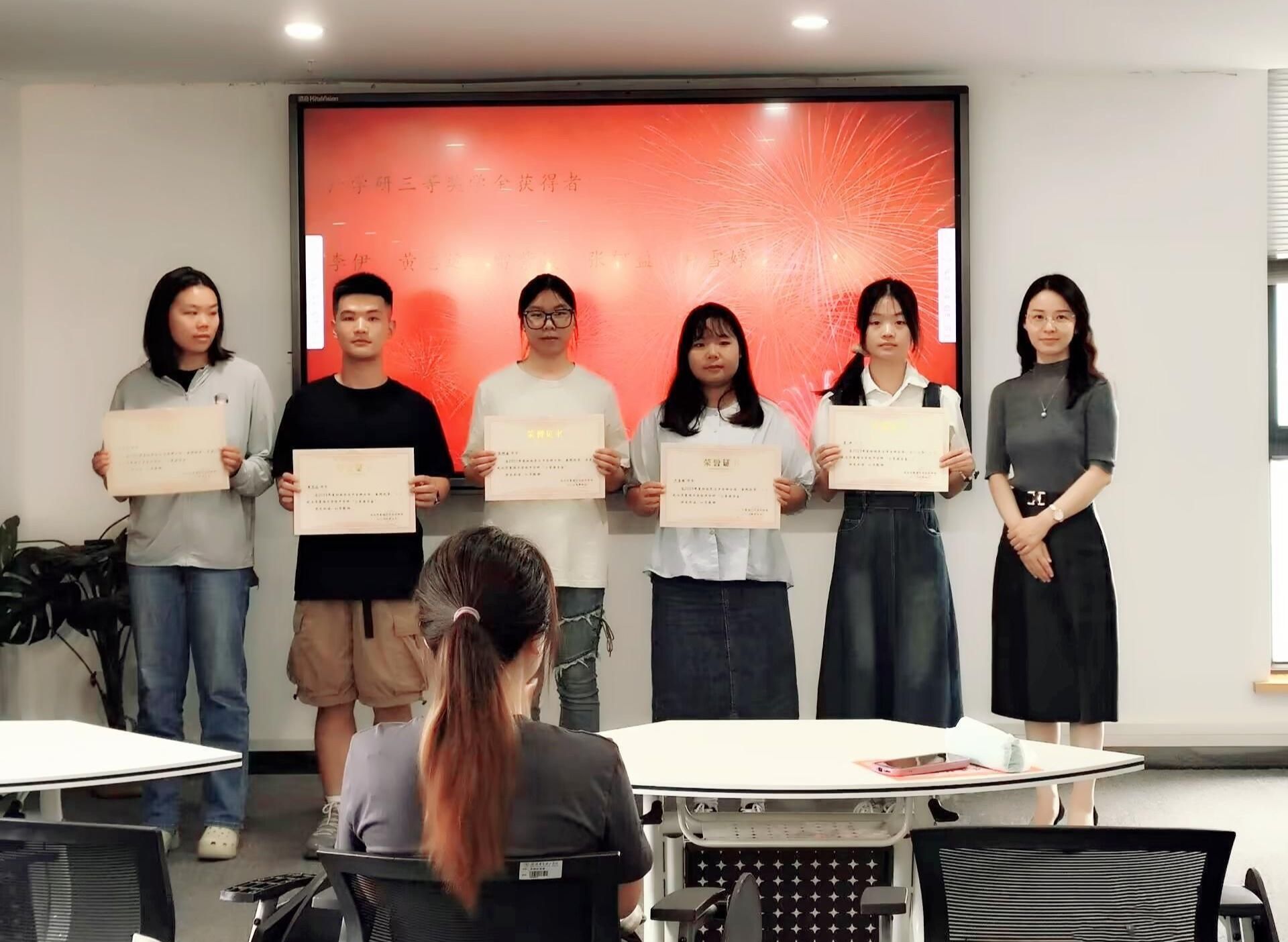 在庄严的颁奖音乐声中,外国语学院学工办主任杨洋、工作室指导老师梁思、陈黎分别为华夏译坊优秀队长、副队长、优秀译员以及获得产学研三等奖学金的队员们颁发证书及奖品。