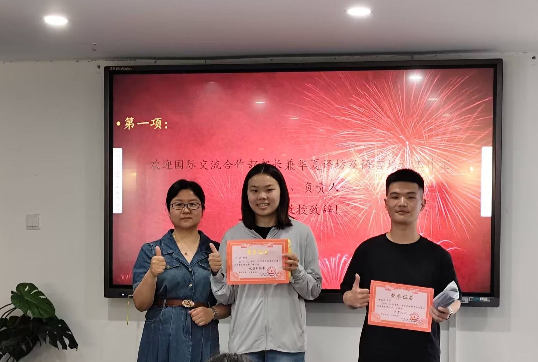 5月30日中午,华夏译坊及语言培训工作室在综合楼1401室举行了第十一届结业颁奖典礼暨第十二届队员迎新仪式。国际交流合作部部长、国际教育学院院长兼华夏译坊创始人、负责人肖凤华教授、外国语学院教学办主任吴敏老师、学工办主任杨洋老师、工作室指导老师梁思、陈黎,及以及两届新老队员参加此次活动。