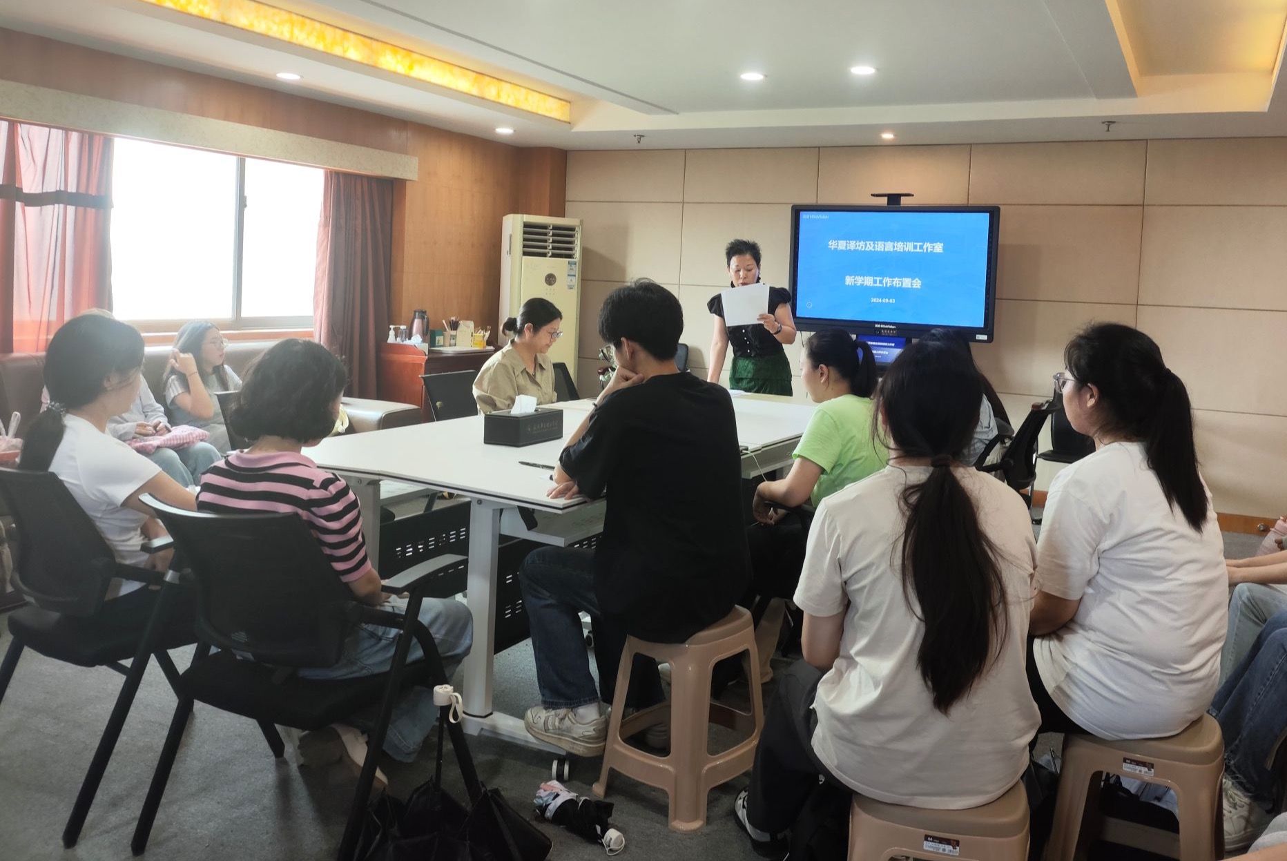 2024年9月3日上午,华夏译坊及语言培训工作室在综合楼1401室举行了新学期工作布置会。国际交流合作部部长、国际教育学院院长兼华夏译坊创始人、负责人肖凤华、工作室指导老师梁思、杨佳婧以及工作室全体队员参加此次活动。