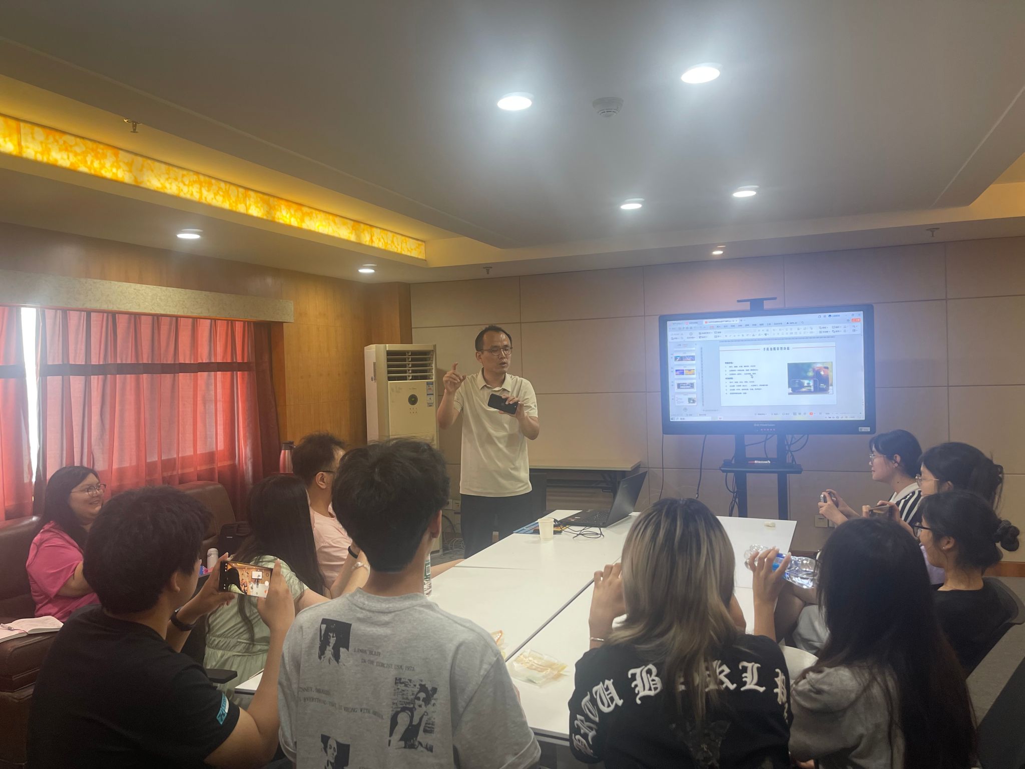 5月20日中午,华夏译坊及语言培训工作室在综合楼1201会议室开展新闻写作和新闻摄影培训会。该培训会邀请党委宣传部副部长、融媒体中心主任张慧、校园文化建设与文明创建工作室主任张培杰作为主讲嘉宾,工作室指导教师梁思、黎文妤及全体队员参加。