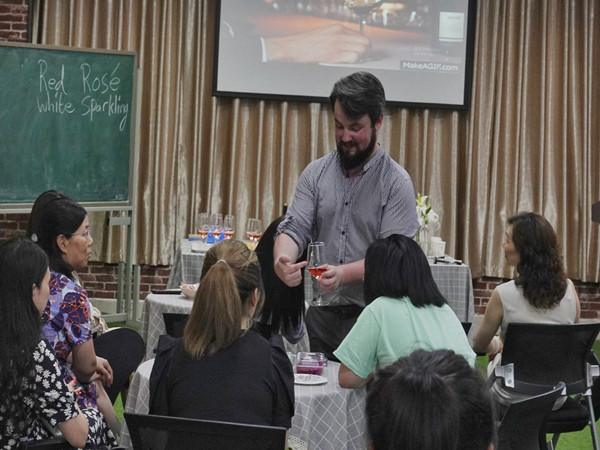 接下来到了品酒环节,在教大家如何用开瓶器打开葡萄酒后,Ieuan开启一瓶rose wine为例,告诉大家葡萄酒的品鉴基本分四步,即一看二摇三闻四尝,并陆续将white, red wine也分享给在场的师生们享用。众人在美妙的莫扎特交响乐声中,品尝着地道的葡萄酒,感受着原汁原味的英文表达。