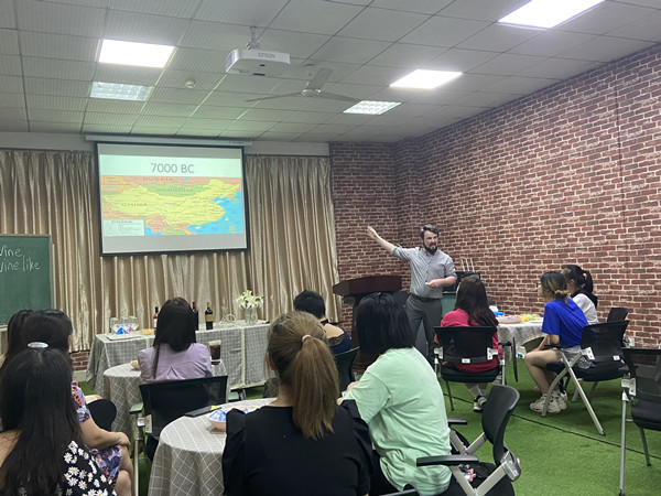 6月11日下午,主题为“葡萄酒品鉴”的第14期国际交流沙龙在语言文学楼313教室举办。校长助理、综合保障部部长李海燕及国际教育学院院长、国际交流合作部部长肖凤华出席此次主题沙龙活动,全校30余名师生参加。