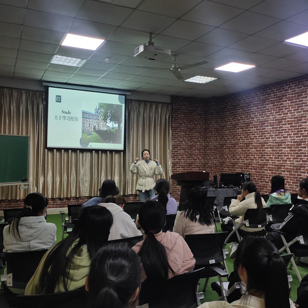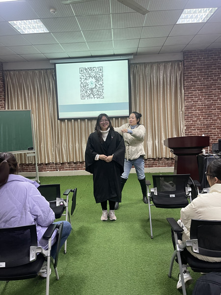 沙龙伊始,主讲人胡璇从留学申请、学习经历和职业规划三个方面与同学们分享了她在海外的留学经历,引起了现场许多学生的向往和钦佩。胡璇老师以自己所毕业的杜伦大学为例,分享了国外学校的建筑风格、教学方式、学习与兼职如何安排时间,以及举行活动时的礼仪,并且还带来了学院风哈利波特式校袍以及毕业论文册,引起了同学们的极大兴趣。