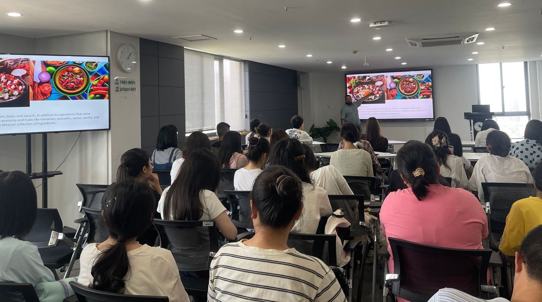 5月14日中午,beat365开展了主题为“从语言和美食感受墨西哥文化的魅力”的第29期国际交流沙龙。本次沙龙邀请了来自美国的Torres先生主讲。华夏译坊及语言培训工作室全体师生、各学院师生代表参加此次主题沙龙活动。
