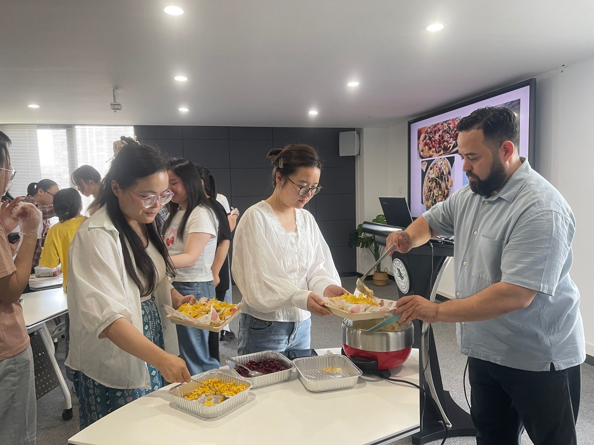 在讲到墨西哥特色美食,不得不提闻名遐迩的塔可和玉米片。在展示了一段墨西哥美食的制作视频后,Torres先生亲自操刀,在现场给大家演示了如何制作塔可和玉米片,并邀请在座师生上台实操及品尝。师生们兴致勃勃、踊跃登台,在Torres先生的指导下纷纷动手亲自制作美食并品尝,不绝于耳的赞美声和争先恐后拍照的人群将整个活动推向高潮。