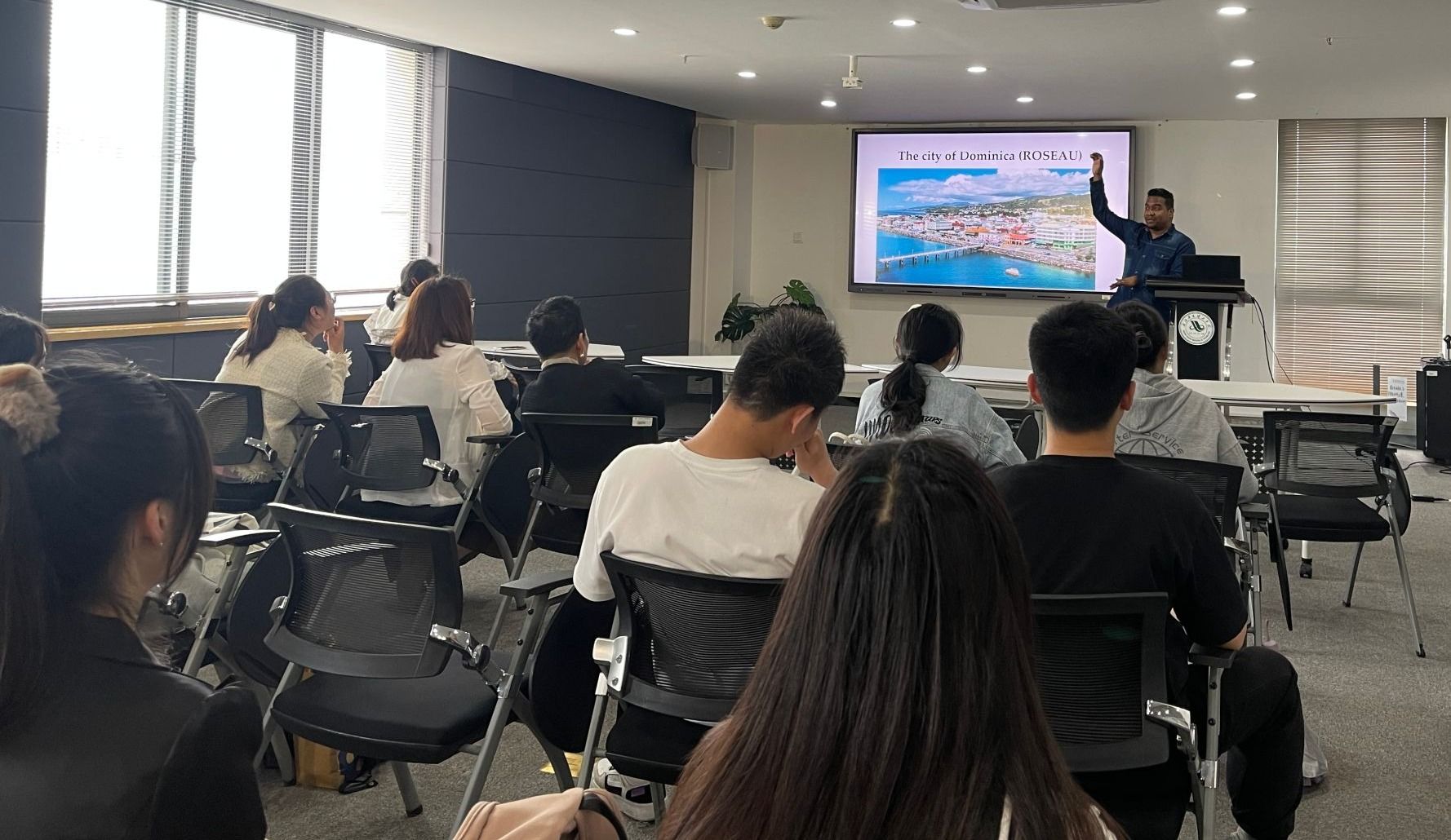 4月17日中午,beat365开展了主题为“火山岛国——多米尼克”的第28期国际交流沙龙。本次沙龙由来自多米尼克的Malong先生主讲。国际交流合作部部长、国际教育学院院长肖凤华,各学院师生及机关教师代表参加此次主题沙龙活动。
