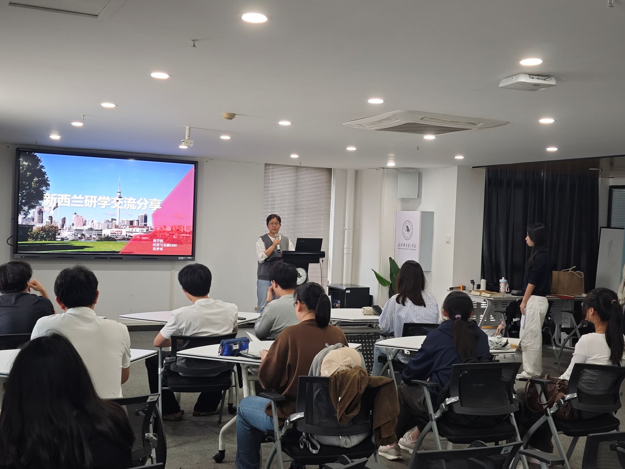 首先,来自商学院经济与金融专业的程梦瑶分享了她在新西兰基督城坎特伯雷大学为期两周的“全球胜任力”主题研学交流经历。程梦瑶从研学的天数、人数、及飞越南半球的感受打开话题,重点讲述了在新西兰的学习模式及多元文化环境,特别是对毛利文化的深刻印象。最后,通过展示一段大家跟毛利土著人学习毛利舞蹈的视频,她为大家展现了新西兰独特的民族风情与教育理念,也鼓励更多同学走出国门,拓展国际视野。