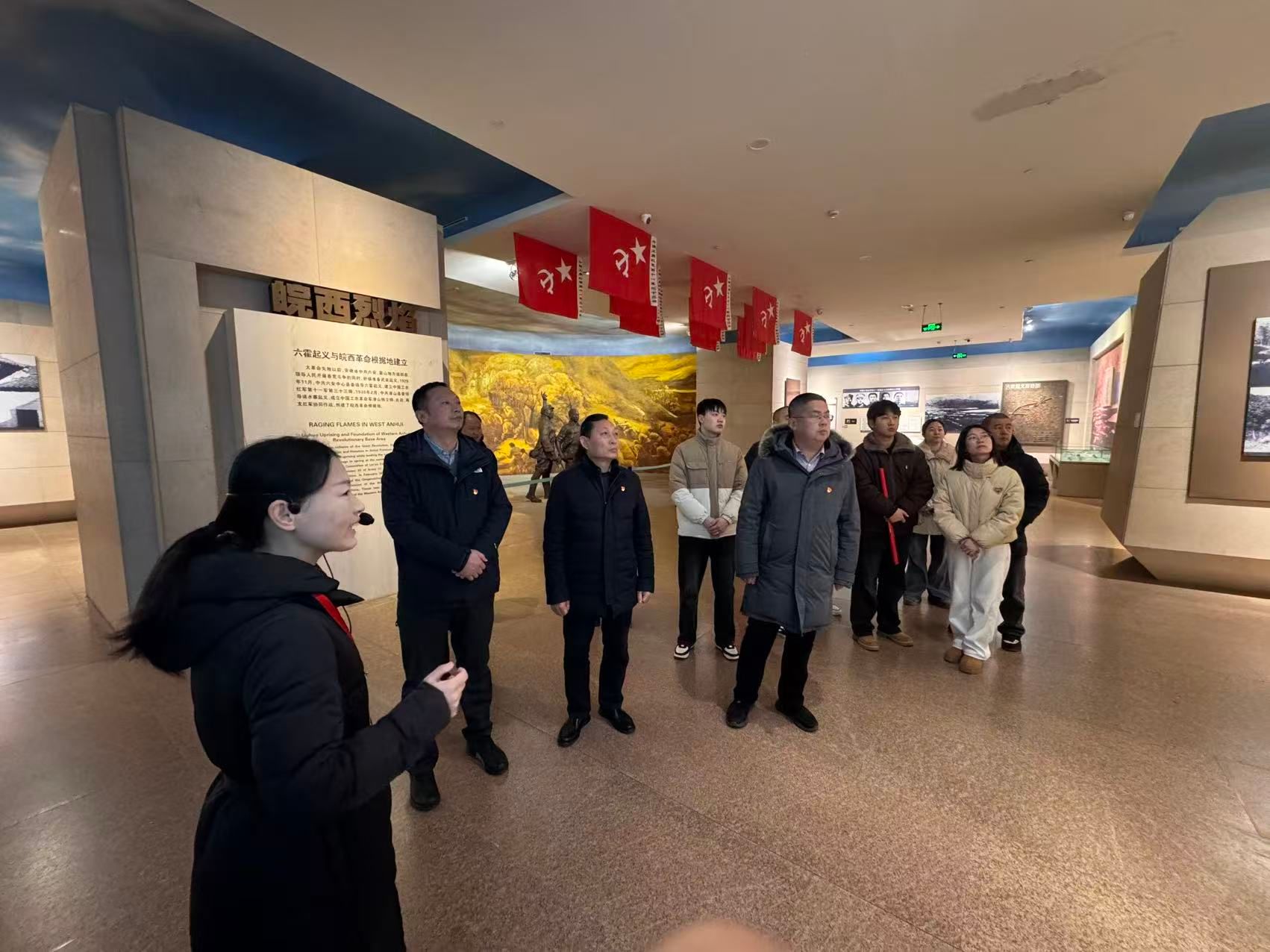 纪念园内苍松翠柏环绕,庄严肃穆。烈士纪念碑广场上,全体党员整齐列队,向革命烈士敬献鲜花,表达了深切的哀思和崇高的敬意。在黄麻起义和鄂豫皖苏区革命历史纪念馆内,全体党员认真聆听讲解。馆内展示了六百余件革命文物、七百余张历史照片,馆内的半景画和大型沙盘模型,生动再现了黄麻起义的战斗场景和鄂豫皖革命根据地的建设历程。声、光、电现代技术手段营造出的沉浸式体验,让大家仿佛穿越时空。当了解到“小小黄安,人人好汉,铜锣一响,四十八万”的革命歌谣时,大家被红安人民前赴后继的革命热情深深感染。