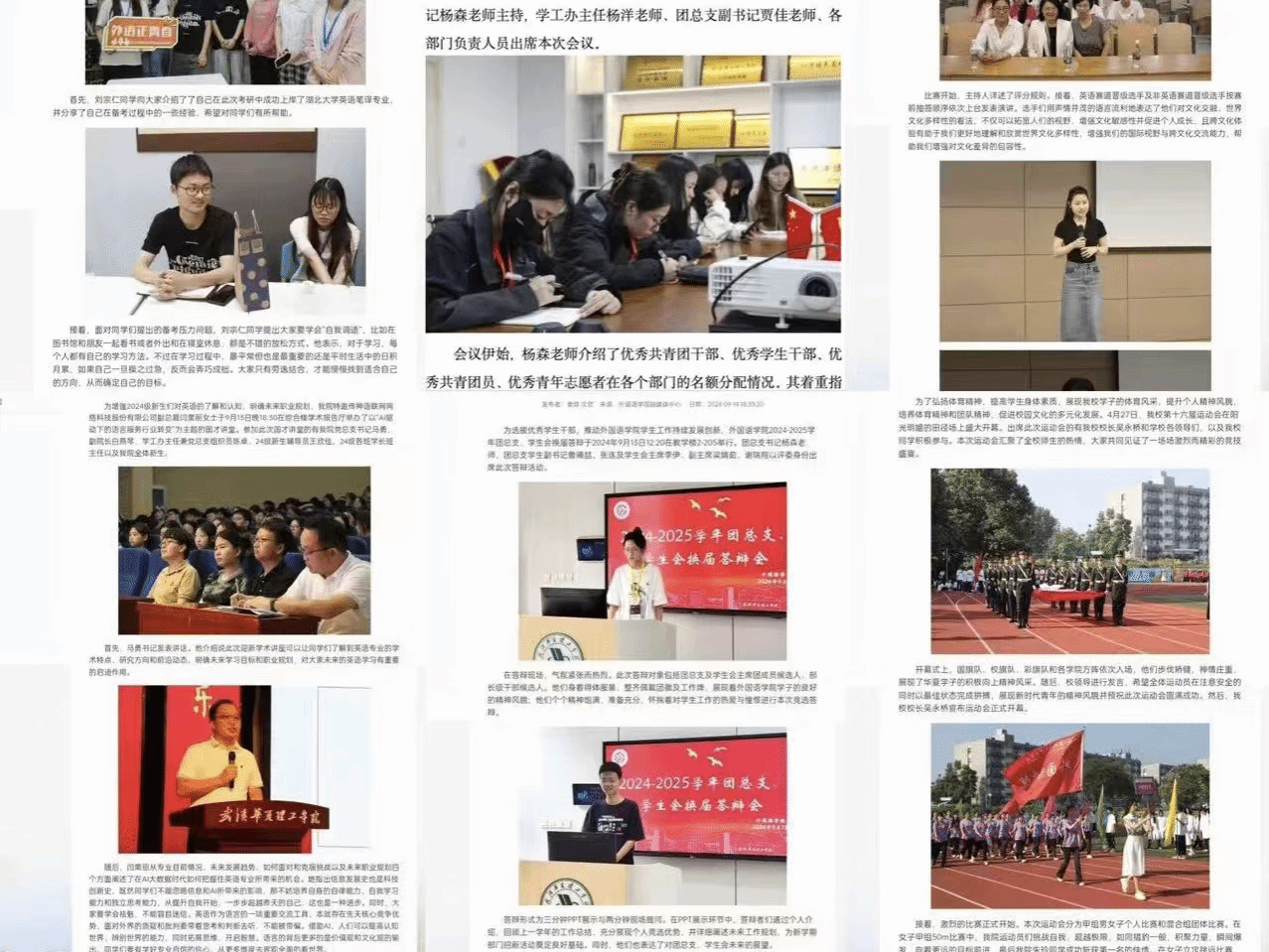 外国语学院团总支主要由秘书部、组织部、融媒体中心三大部门组成。秘书部是团总支部门的中枢机构,上传下达,发挥协调作用。大型活动中积极配合,做好工作,提供必要的帮助。主要负责团总支文件资料的收发、登记、批办、传递、催办、归档等工作。组织部是联系团委、团总支、团干和团员的纽带,主要起到上通下达、组织宣传的作用,协助加强全院共青团思想建设、组织建设,以及共青团干部培养。熟悉掌握全院团组织的基本情况,了解基层团组织的活动、生活情况,负责团员发展、团组织关系转接、推优入党、团日活动、团费收缴与管理、青年大学习等一系列团内工作和活动。融媒体中心主要通过官方微信公众号、抖音号等多种新媒体平台,致力于讲述华夏故事,传递独特的外语声音。主要负责策划、宣传和报道各类活动,还致力于提高外院文化传播的时效性和影响力。