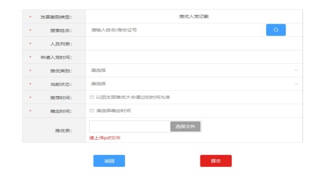 ②“团内激励”-“发展激励”-“推优入党记载”,将信息规范填写,并上传已规范填写的PDF版“推优入党审核表”。