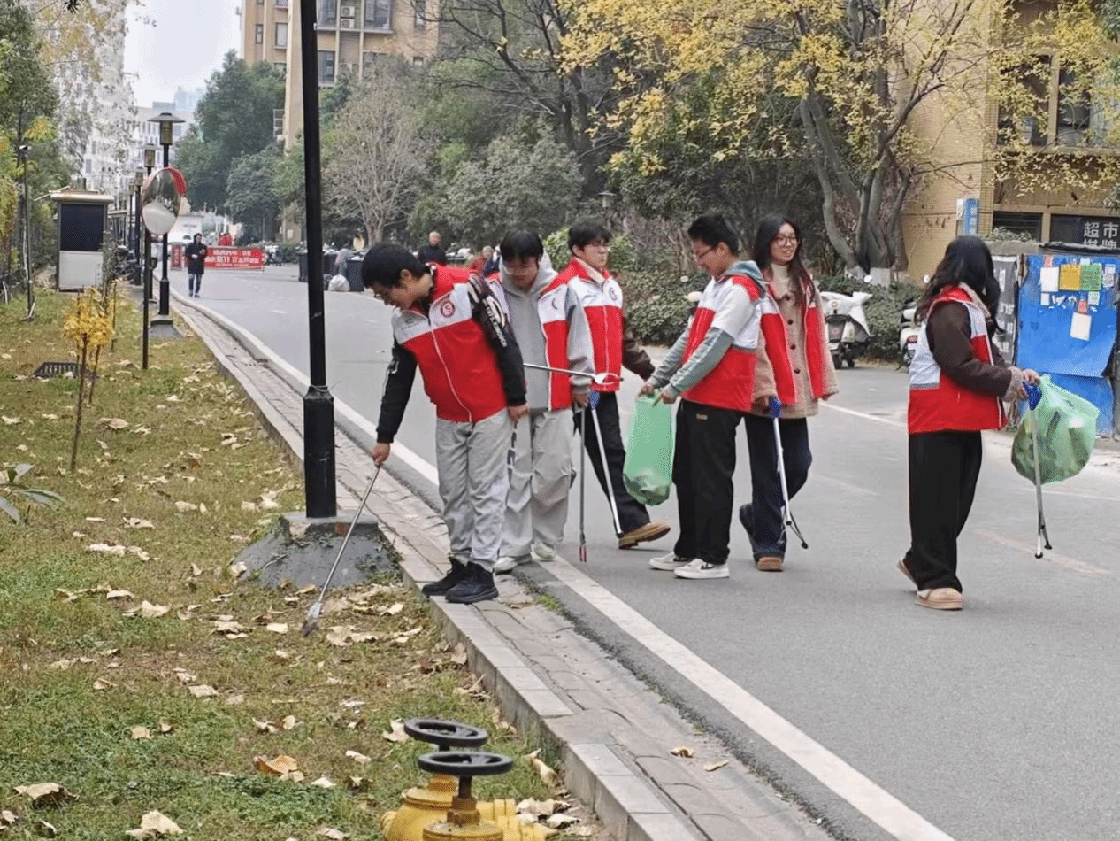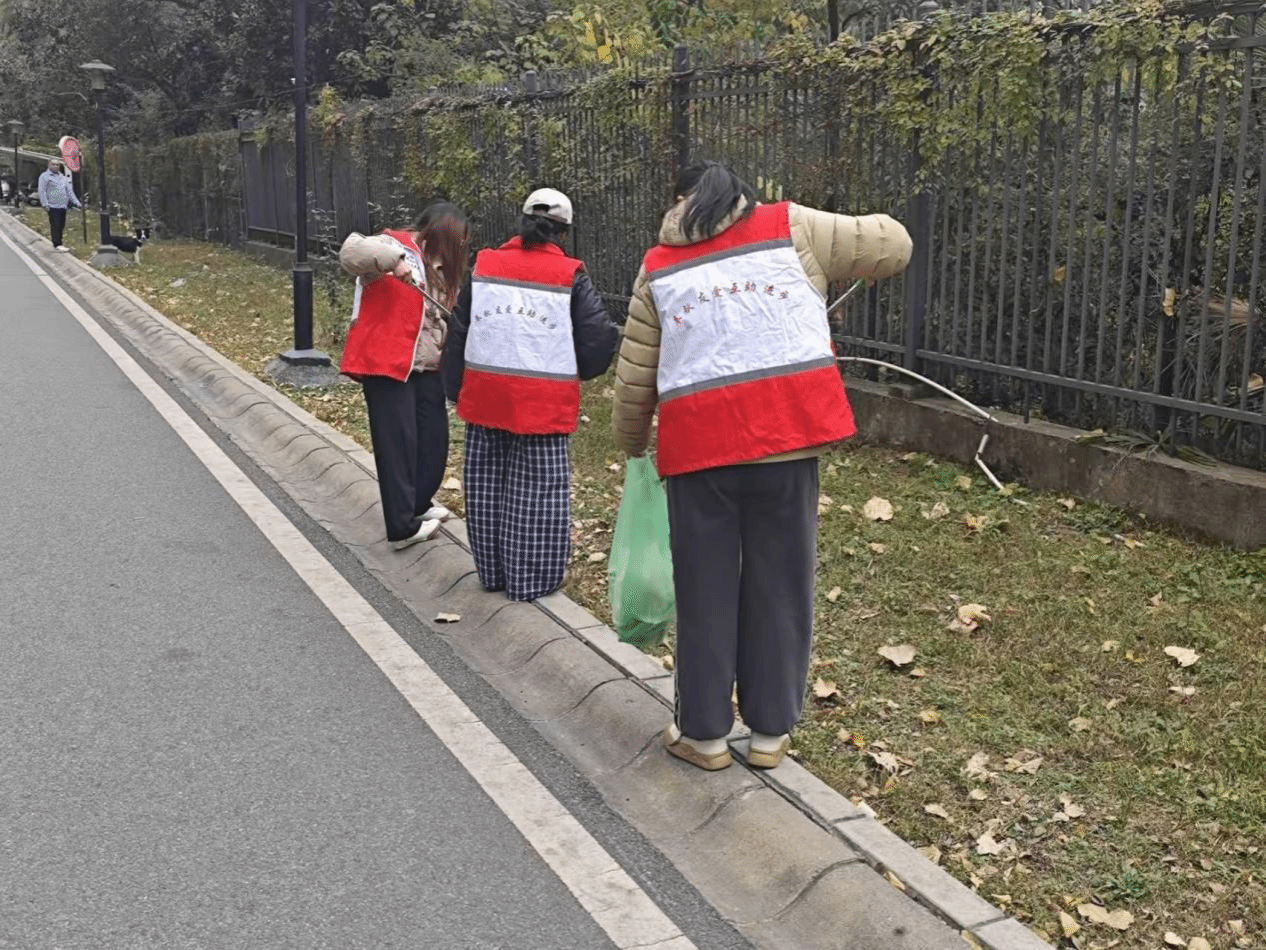 晴朗的午后,社区街巷间暖意融融。几名身着红白志愿马甲的身影格外亮眼:他们或手持垃圾夹俯身捡拾路边碎屑,或提着环保袋分类收纳散落杂物,烟头、纸屑、废弃包装物被一一清理。