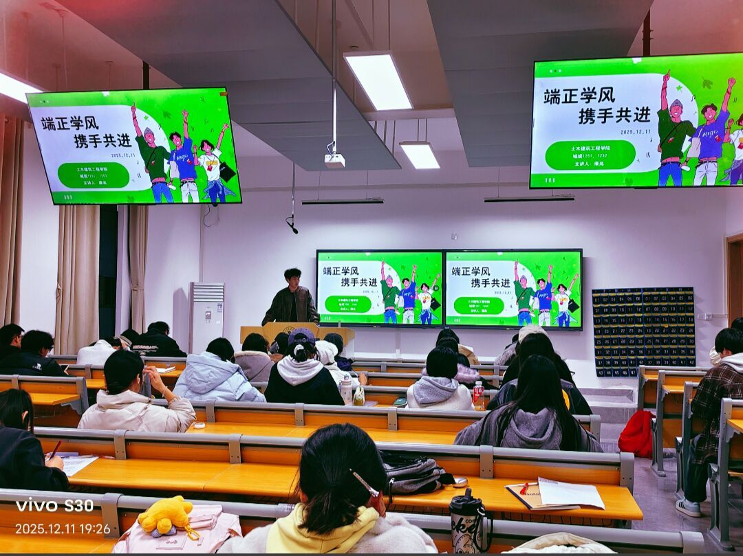 为深化学风建设实效,让学生成为学风建设的主角,2025年12月11日晚,土木建筑工程学院城规1251、1252班于学院阶梯教室开展“端正学风 携手共进”主题团日活动。本次活动一改传统主讲模式,由学生代表牵头分享,城规1251、1252班全体同学参与其中,共同探讨学风建设的青春答案。