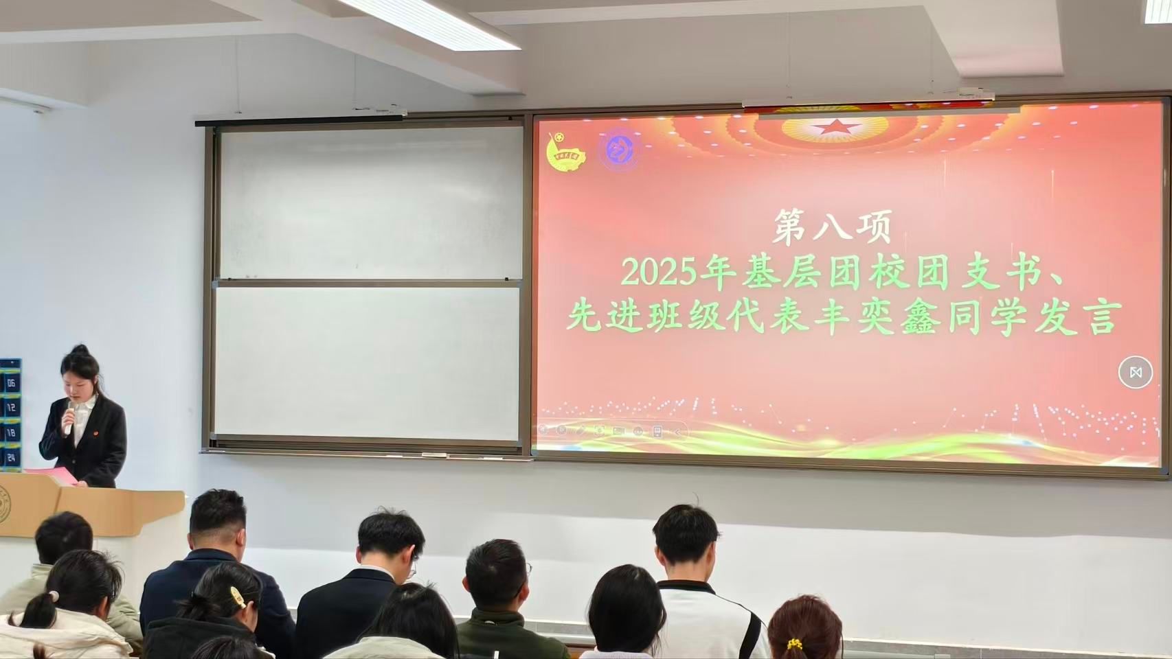 其后,基层团校团支书、先进班集体代表丰奕鑫同学在发言中分享了学生干部在推动班级建设、营造优良学风中的实践与感悟,表达了将继续履职尽责、带动同学共同进步的决心。