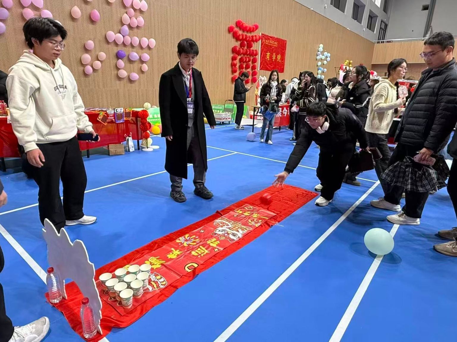 其中,外国语学院展区以“语通世界,乐传新春”为主题,成为全场焦点之一。学院设置了“萌趣保龄”“糖韵萌趣”“墨香迎岁”等传统文化互动任务,“萌趣保龄”以醒狮主题赛道搭配彩杯球瓶,师生投掷小球的过程中,红金配色的布置让传统年味与趣味游戏相融合;还特别策划了系列体验环节,外院学子在组织与参与中展现出良好的协作意识和活泼的青春姿态,成为游园动线中一道亮丽的风景。