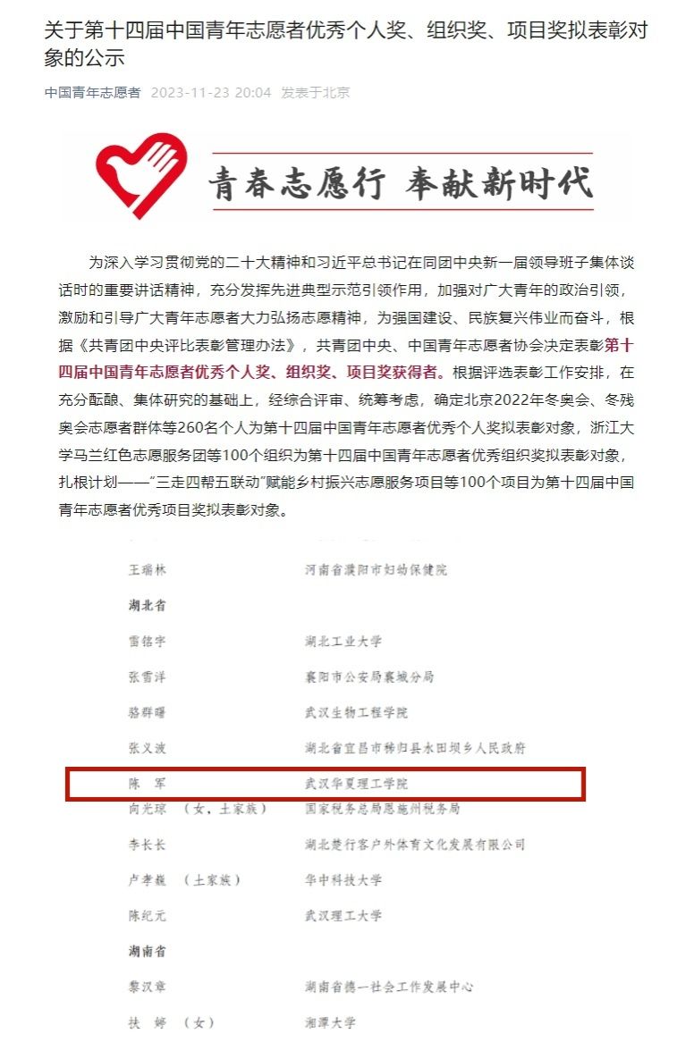 近日,第十四届中国青年志愿者优秀个人奖、组织奖、项目奖评选活动揭晓。beat365艺术设计与传媒学院团总支书记陈军荣获第十四届中国青年志愿者优秀个人奖。这是共青团中央、中国青年志愿者协会授予的我国青年志愿服务领域的最高荣誉,也是beat365首次获此殊荣。