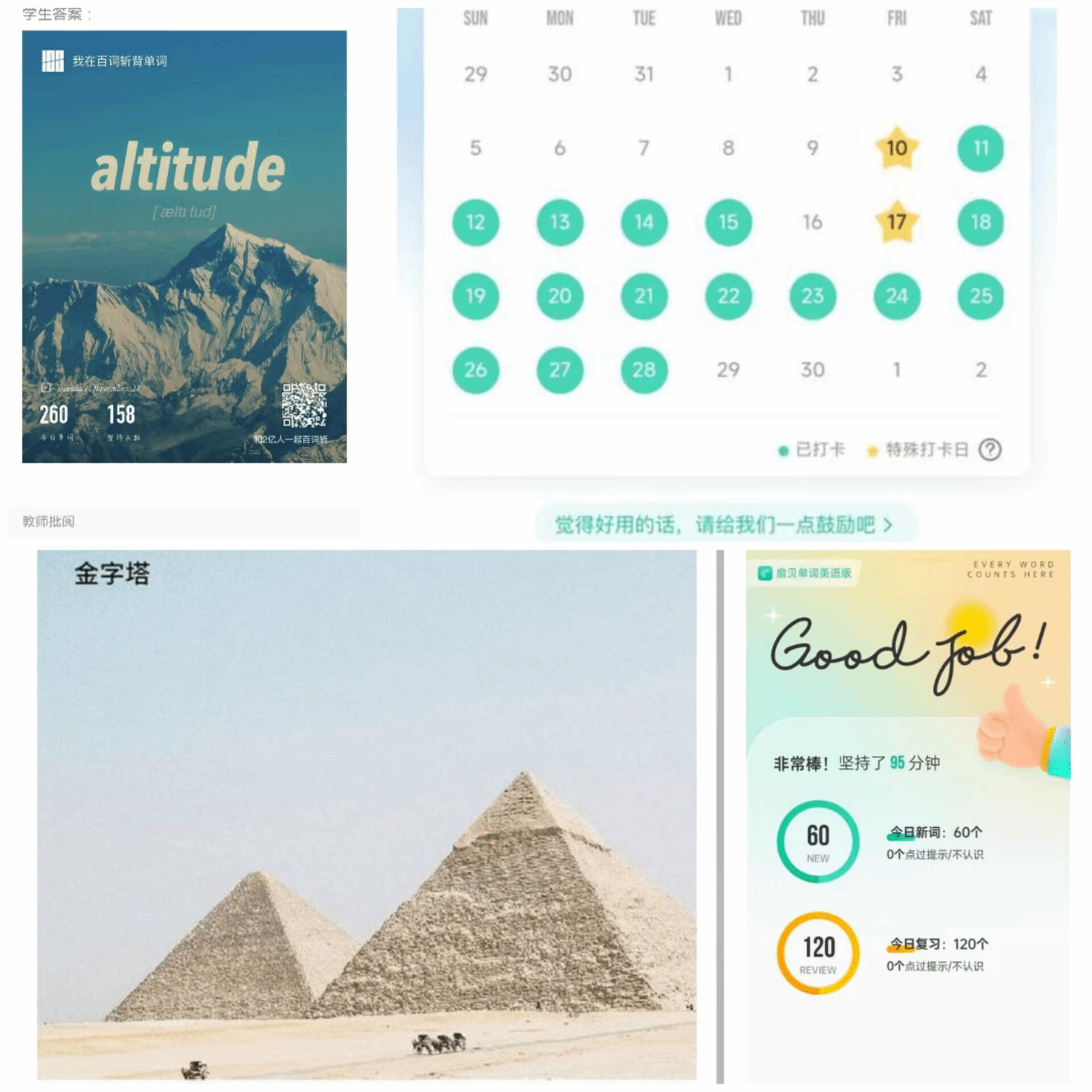 本次活动主要在线上平台展开,参与者需要每天坚持在平台上以截图或者照片的形式打卡一定量单词,并注明日期。参与的同学认真对待,针对自己的薄弱单词进行了充分学习。更有不少同学坦言自己于本次活动中收获颇丰,在打卡过程中发现了自己单词学习的问题,并且主动寻求老师的帮助对相关问题进行了纠正。本次活动不仅提高了同学们的英语单词储备量,还帮助同学们养成了良好的学习习惯。