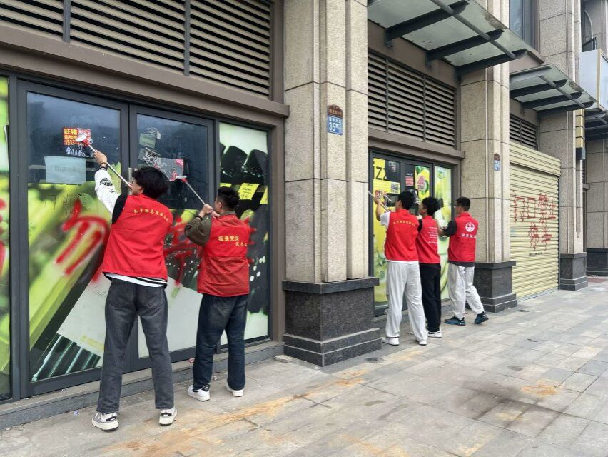 活动中,志愿者们身着统一服饰,并分为两组,一组负责铲除小广告,一组负责清扫街道。铲除小广告组携带小铲子、喷壶等专业工具,重点针对社区内的墙壁、电线杆、公告栏等部位的小广告进行彻底铲除。对于粘贴牢固的广告,先喷水浸湿,再小心铲除,确保清理干净且不损伤公共设施表面;街道清扫小组的任务则是手持扫帚、垃圾袋等清洁工具,对社区道路进行全面清扫,将落叶、灰尘等垃圾集中清理;细致清理花坛内的烟头、废纸等杂物,精心擦拭楼道扶手,认真清理楼道角落的堆积物,使社区公共区域整洁有序。志愿者们劳动的同时也耐心、热情的与居民交流,积极倾听居民的意见,根据实际情况,收集设施,以便居民分类投放。
