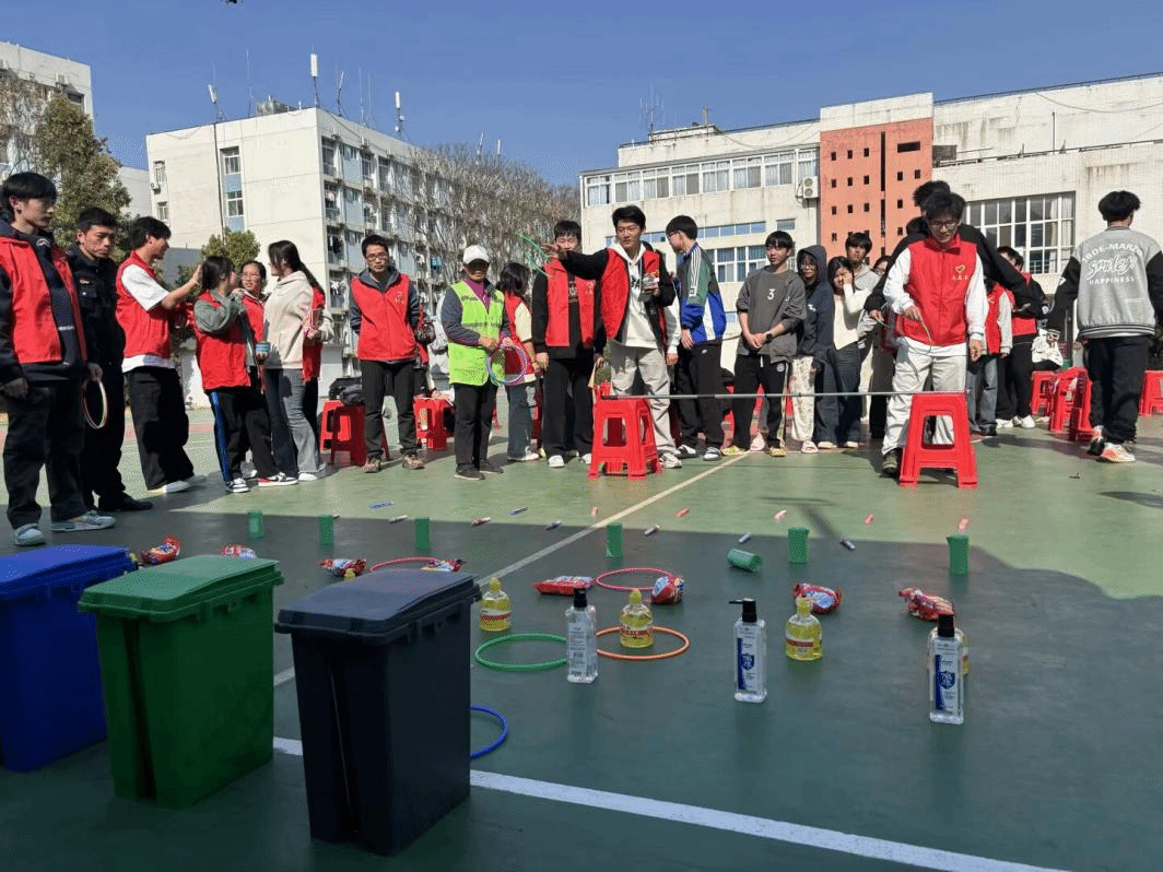 活动现场设置了丰富多彩的互动环节。在垃圾分类套圈游戏区,参与者需将标有不同垃圾名称的圈环投掷至对应的分类桶中,套中者即可获得环保水杯、环保袋等精美奖品。与此同时,垃圾分类知识问答区也吸引了大批师生驻足,题目涵盖垃圾分类基础知识、实际操作技巧等内容,答对者同样可获得纪念品。现场活动气氛热烈,参与活动的师生不仅收获了乐趣,同时学习到了丰富的垃圾分类知识。
