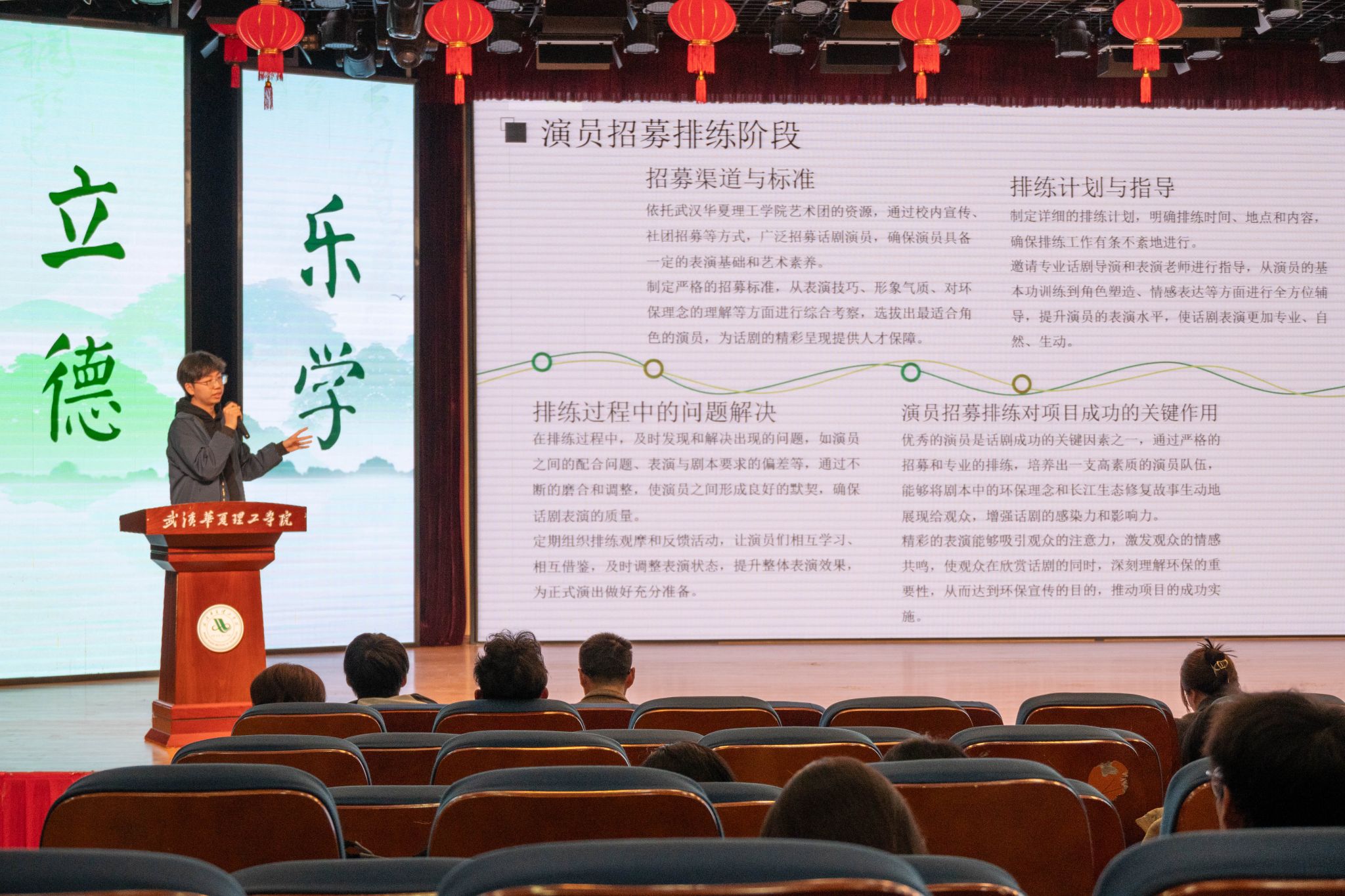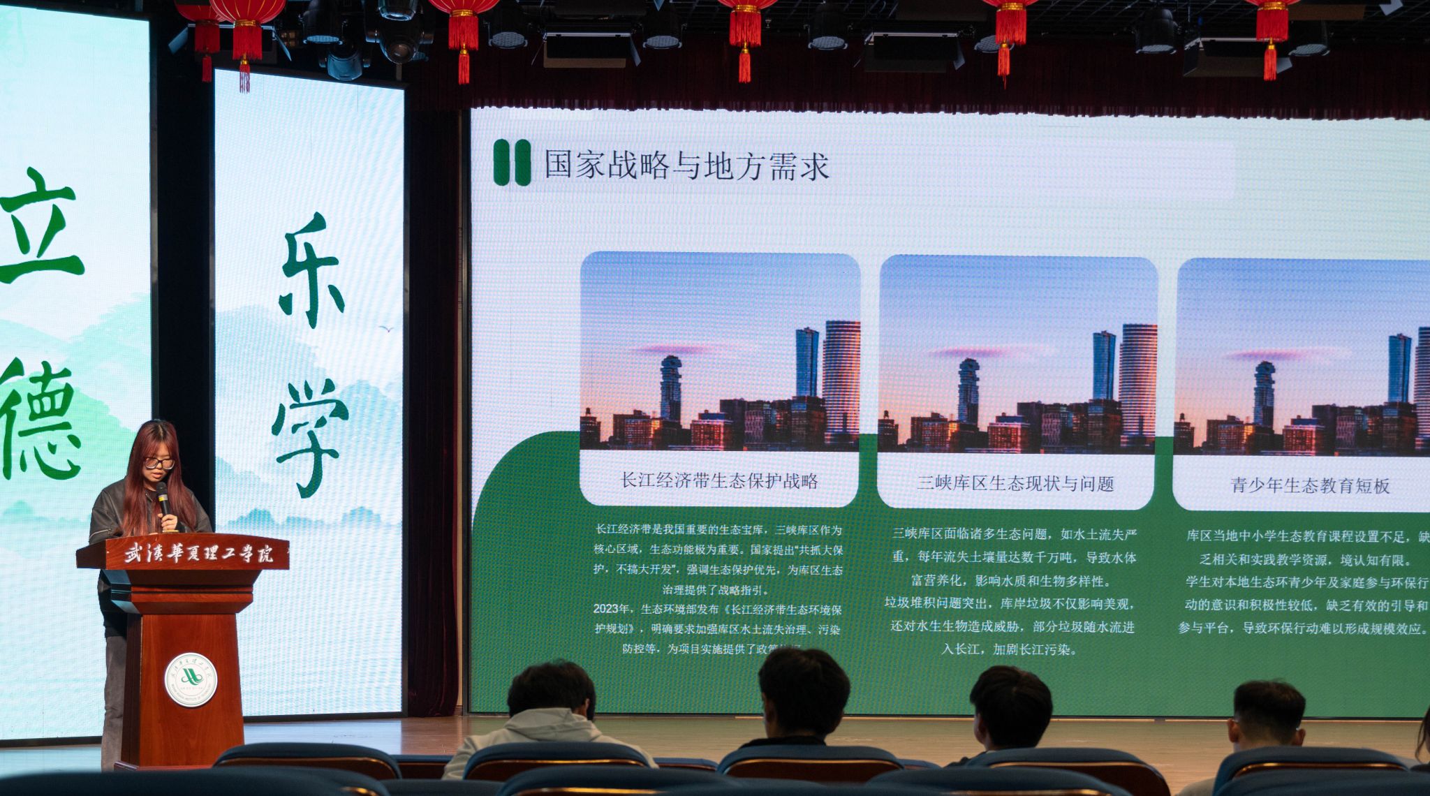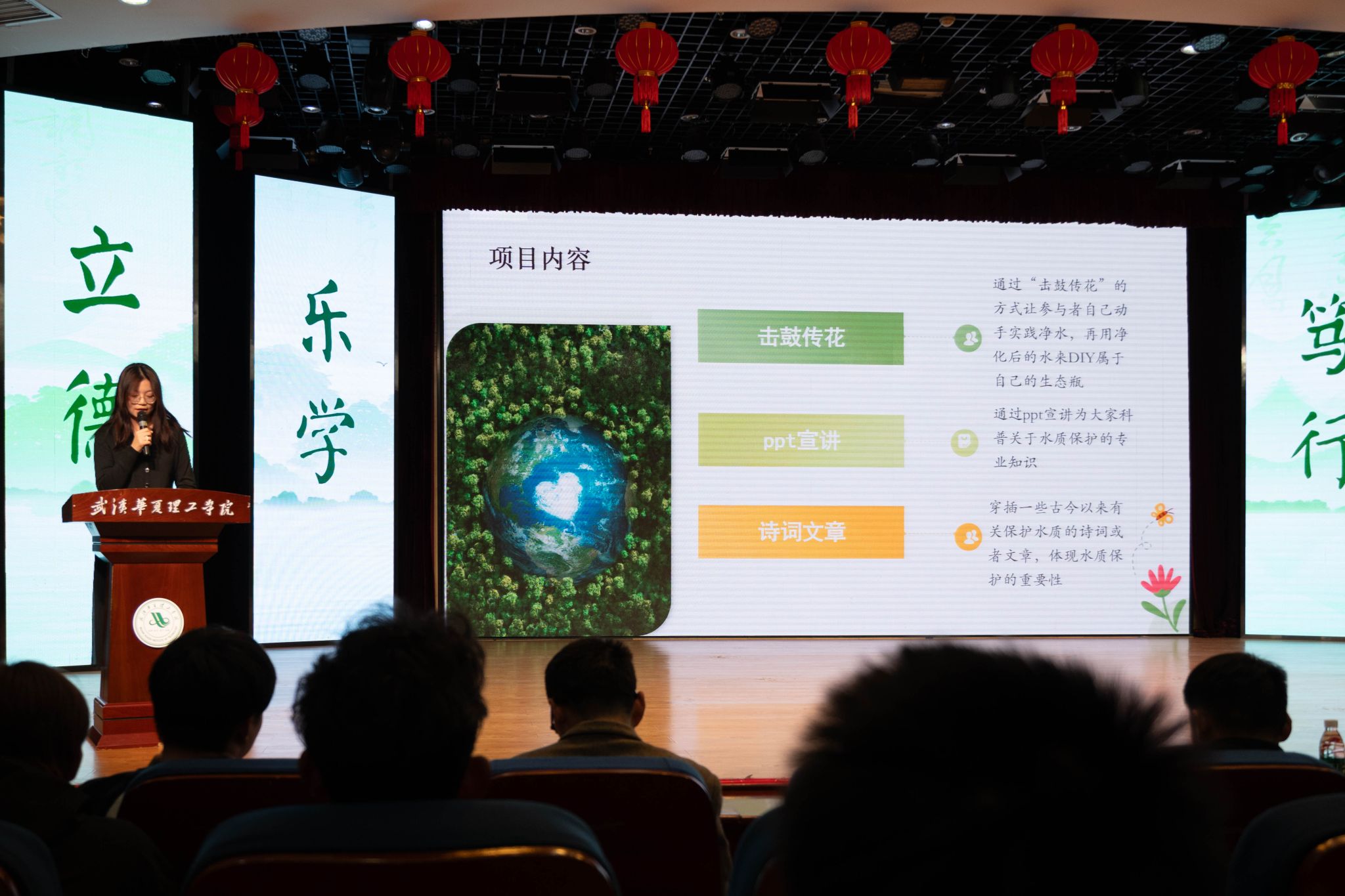 4月1日晚,第八届湖北高校“与绿同行”大赛暨生态环境志愿服务项目培育活动beat365官方网站校赛在学术报告厅举行,武汉理工大学副教授王石径、武汉生态环境志愿服务总队骨干志愿者金宪琦、武汉生态环境局刘婷婷、校团委书记潘晶担任决赛现场评委,各学院的师生代表也积极参与其中,共同见证了这场聚焦生态环境保护的盛会。