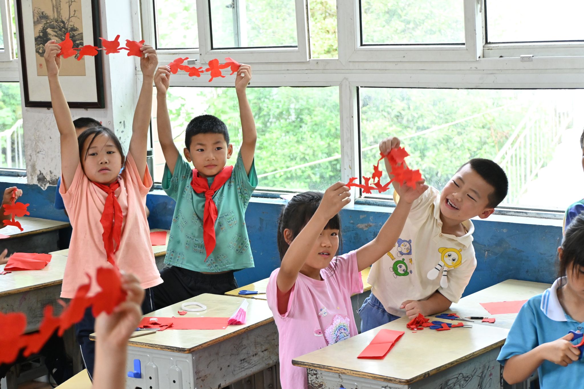 在大班音乐课上,志愿者带领孩子们学唱《青春修炼手册》,并鼓励他们自选歌曲演唱,教室里歌声嘹亮、欢乐洋溢。小班则体验传统剪纸艺术,在志愿者指导下剪出“手拉手的小娃娃”,孩子们动手实践,作品生动有趣,成就感满满。