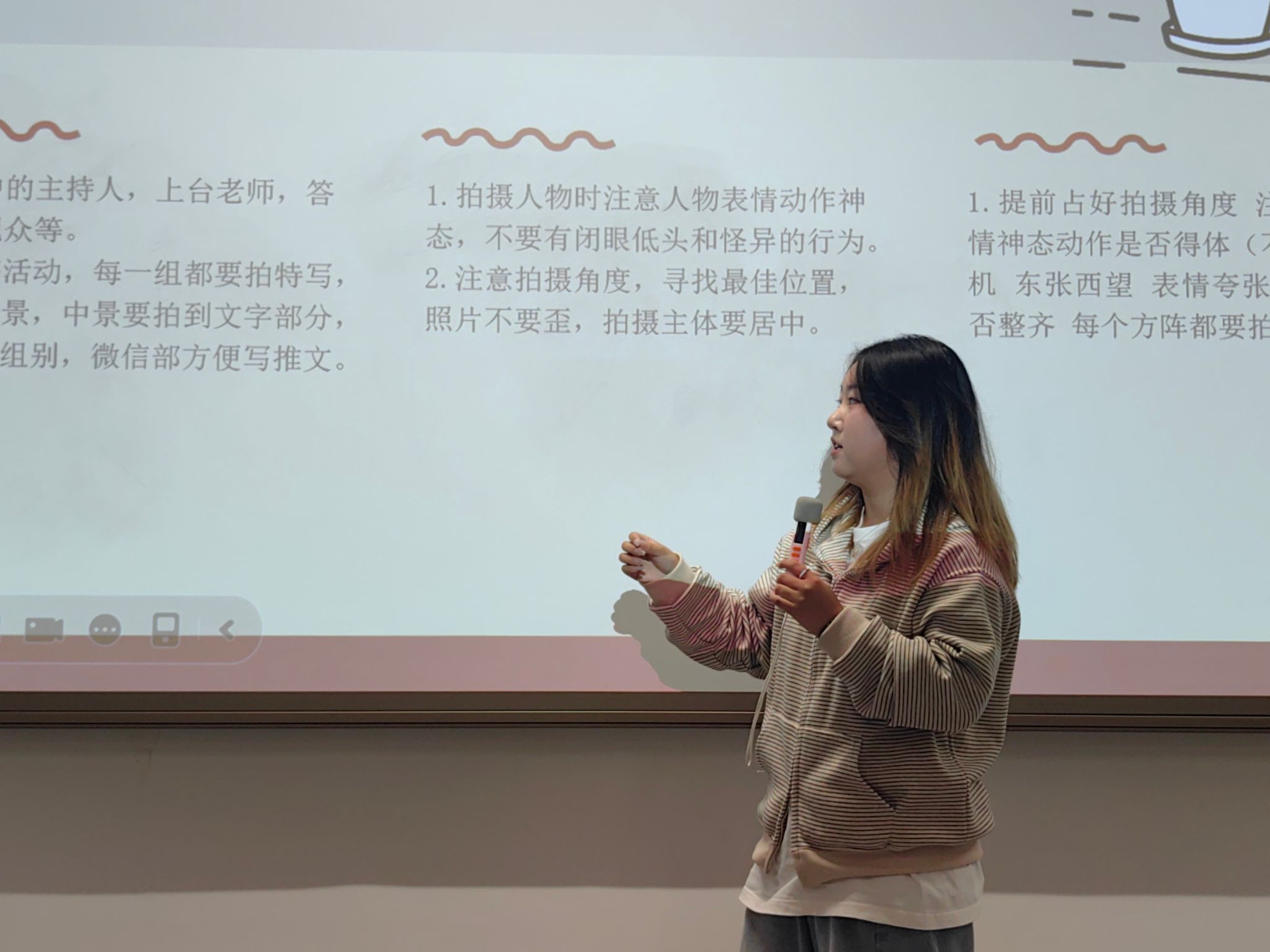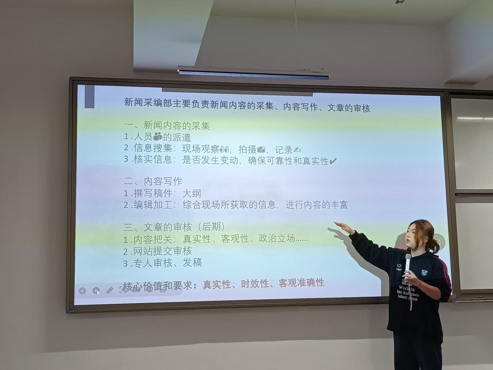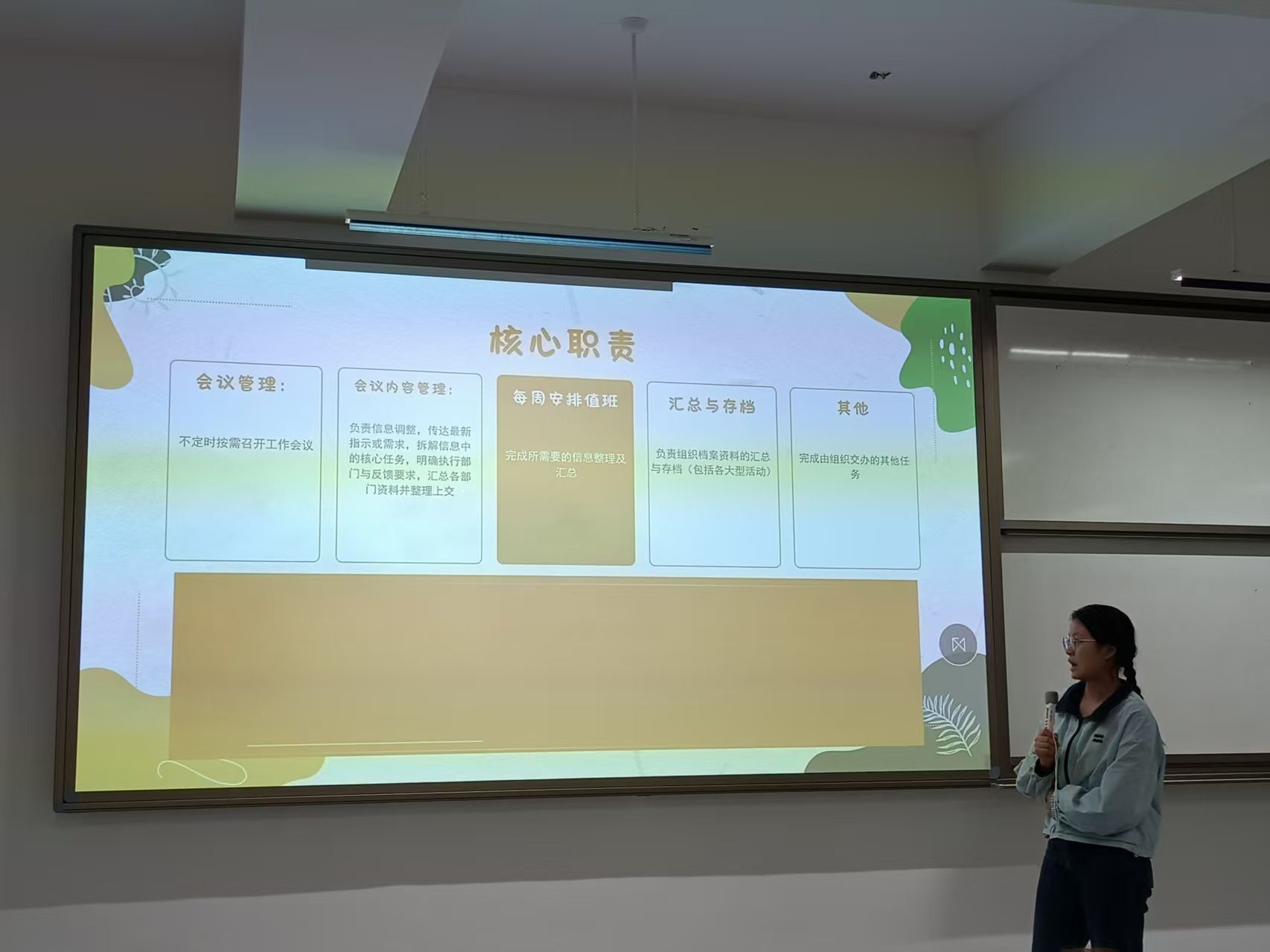 接着,会议进入部门工作交流环节。各个部门的部长依次上台向新成员系统介绍了各部门的核心职能与工作方法,并展示了部门的骨干阵容。部长们的讲解深入浅出,“干货”满满,不仅清晰地勾勒出各自领域的工作蓝图,更通过介绍老成员,构建起“传、帮、带”的支撑体系,让新干事们对未来的实战充满信心与期待。