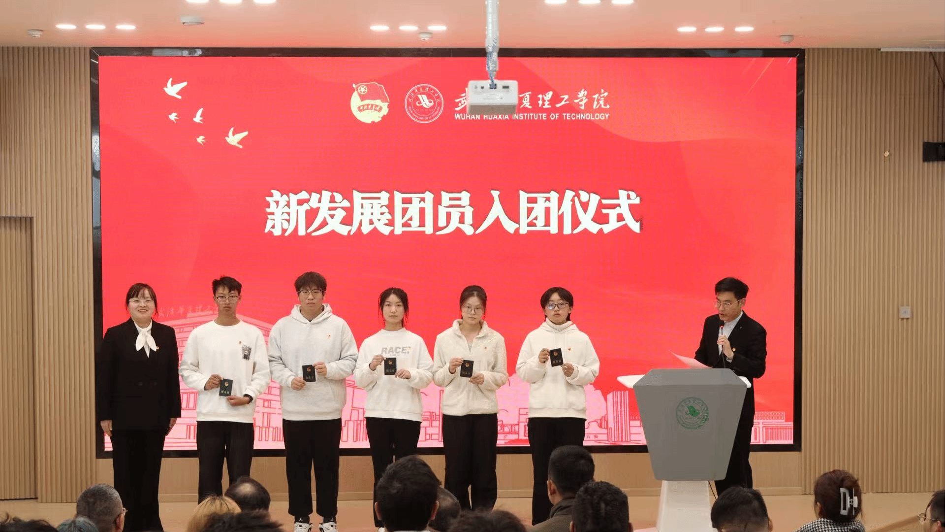 紧接着,在庄重的新发展团员入团仪式环节,校团委书记潘晶为新发展团员代表颁发了团员证。随后,在领誓人李军同学的带领下,全体新团员面向团旗,举起右拳,庄严宣誓。铮铮誓言表达了他们坚定不移跟党走、为共产主义事业奋斗终生的信念与决心。
