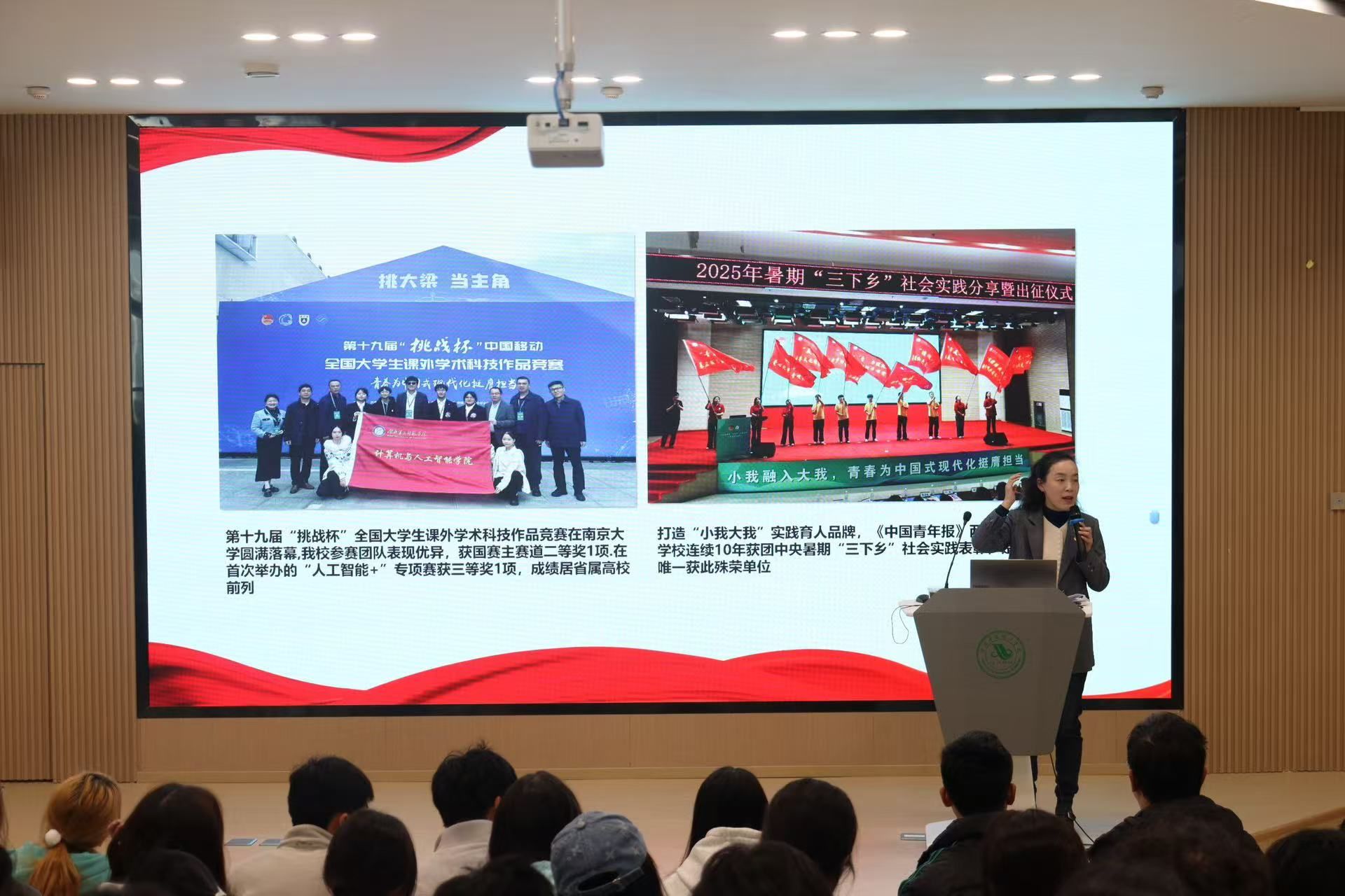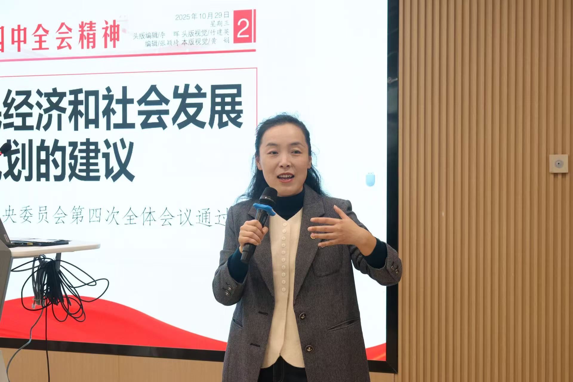 在谈到聚焦全面推进高质量现代化的时代命题时,张静老师着重强调,新发展理念是引领发展的“指挥棒”,创新、协调、绿色、开放、共享的要求需贯穿青年成长与实践全过程。她结合二十届四中全会提出的“推动经济实现质的有效提升和量的合理增长”重要论述,勉励青年学子有同样理念,在专业学习中锤炼创新本领,在社会实践中践行协调发展理念。
