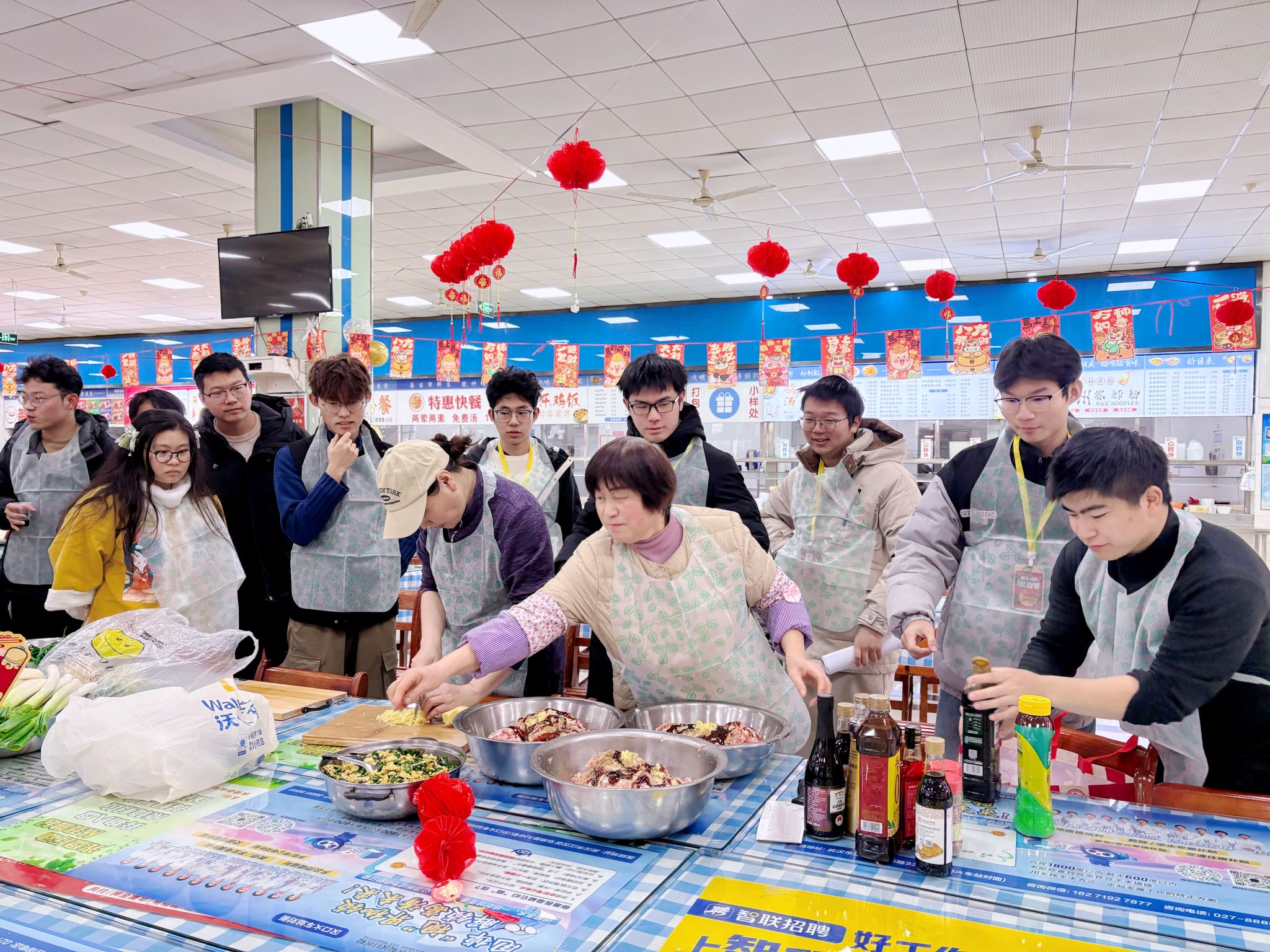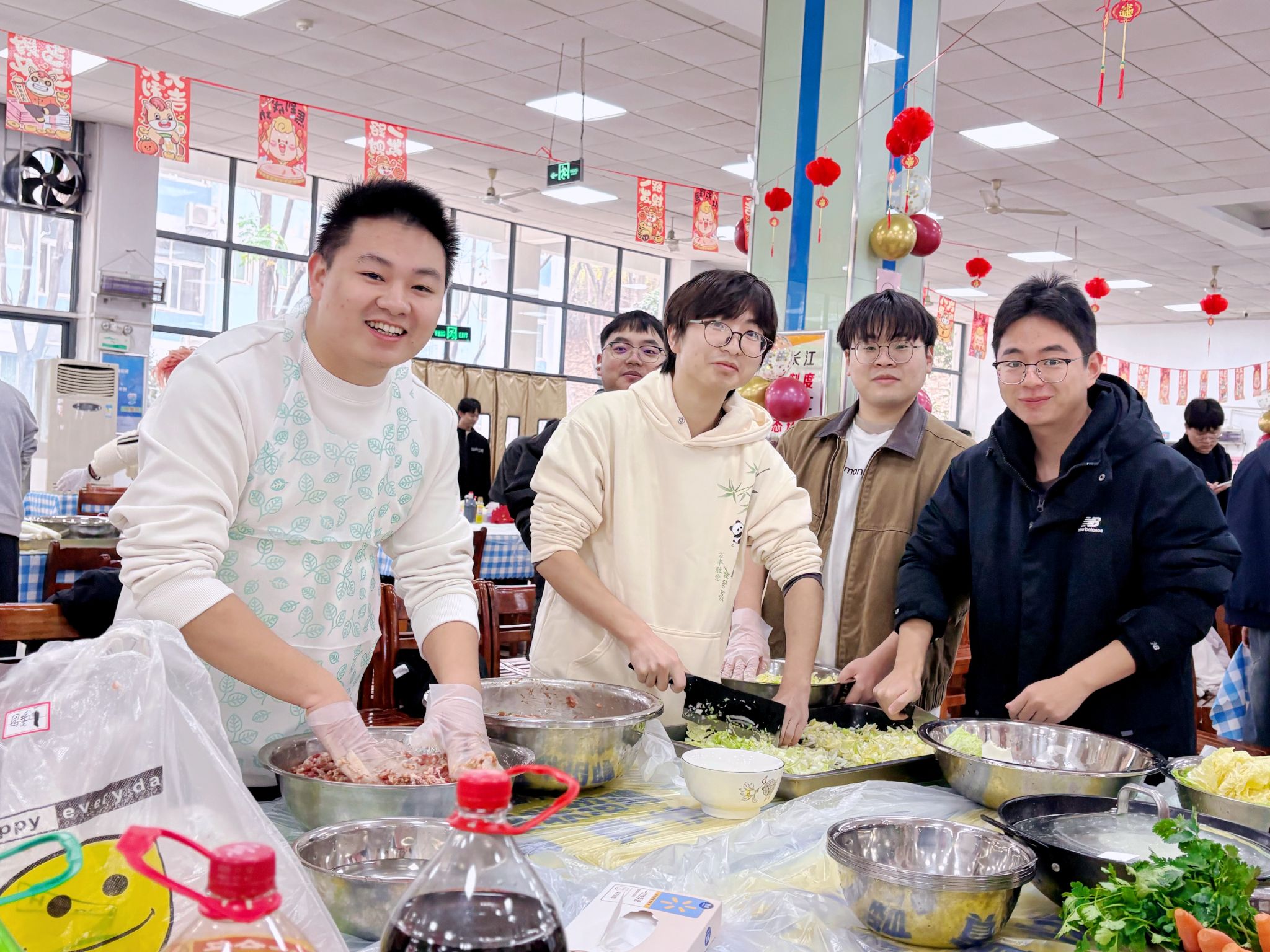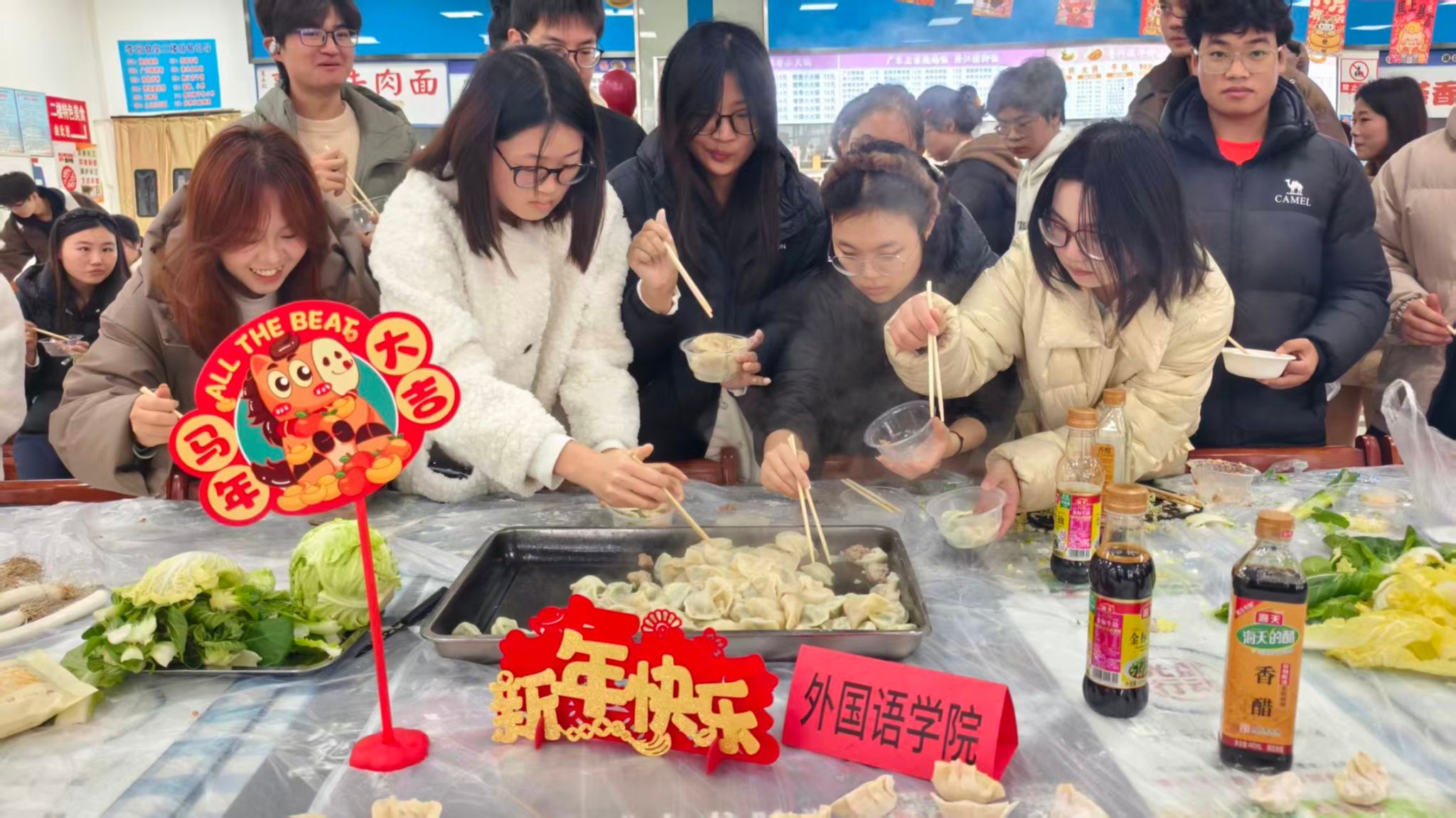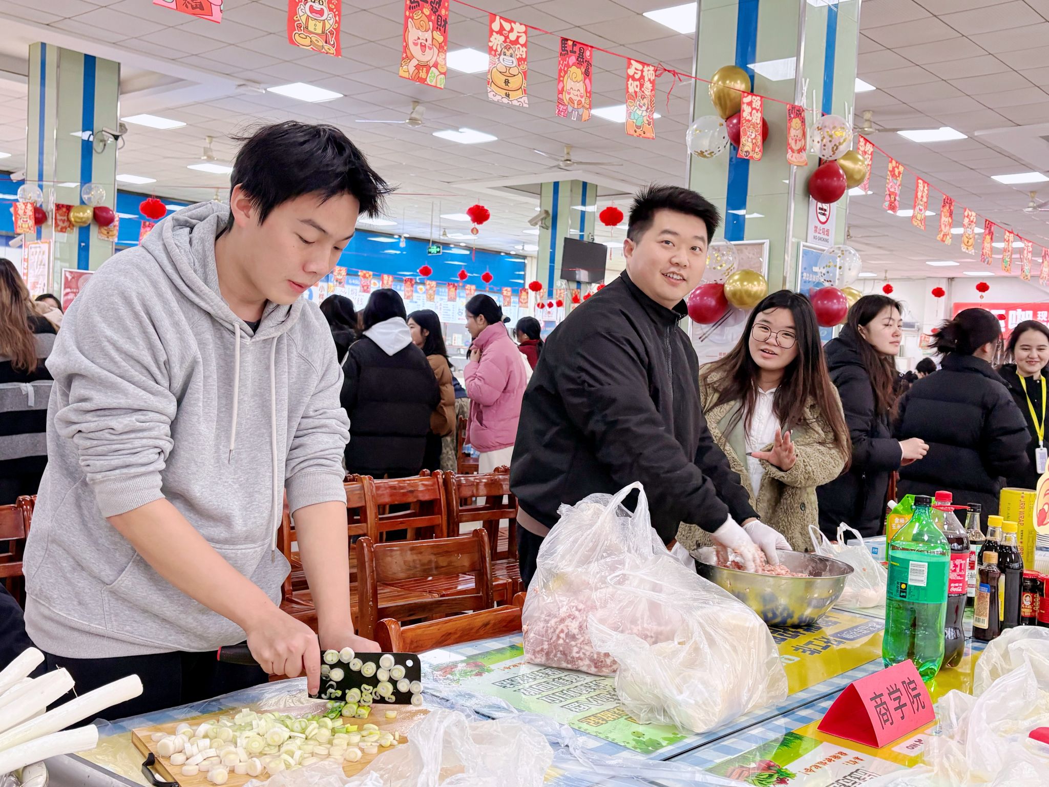 开幕式后,师生们纷纷来到各自学院的展台,投入到饺子馅的制作中。大家分工协作,择菜、剁肉、调馅,每一个步骤都配合得默契十足,鲜香的馅料在众人的巧手下逐渐成型。随后,工作人员将调好的饺子馅、擀好的饺子皮整齐分发,包饺子环节正式拉开帷幕。