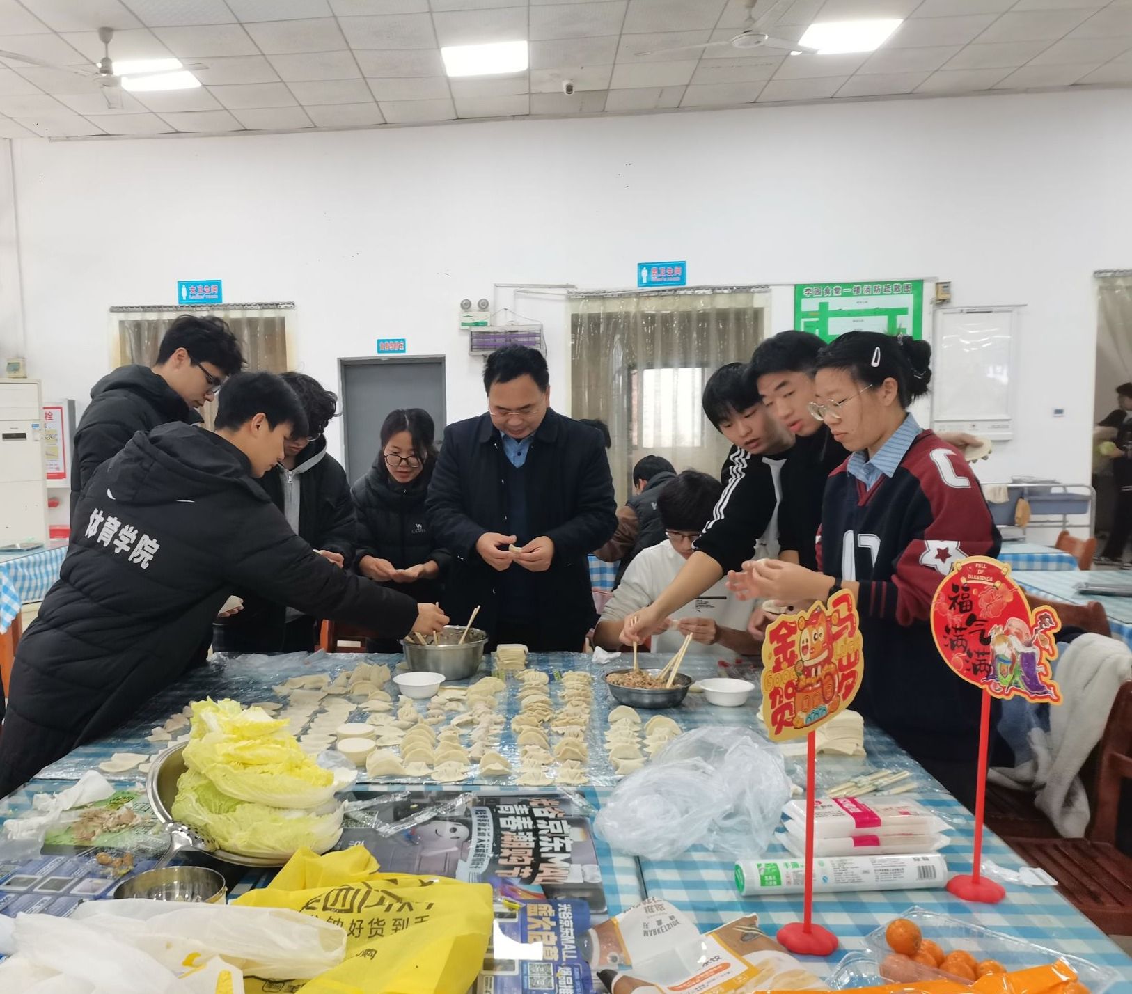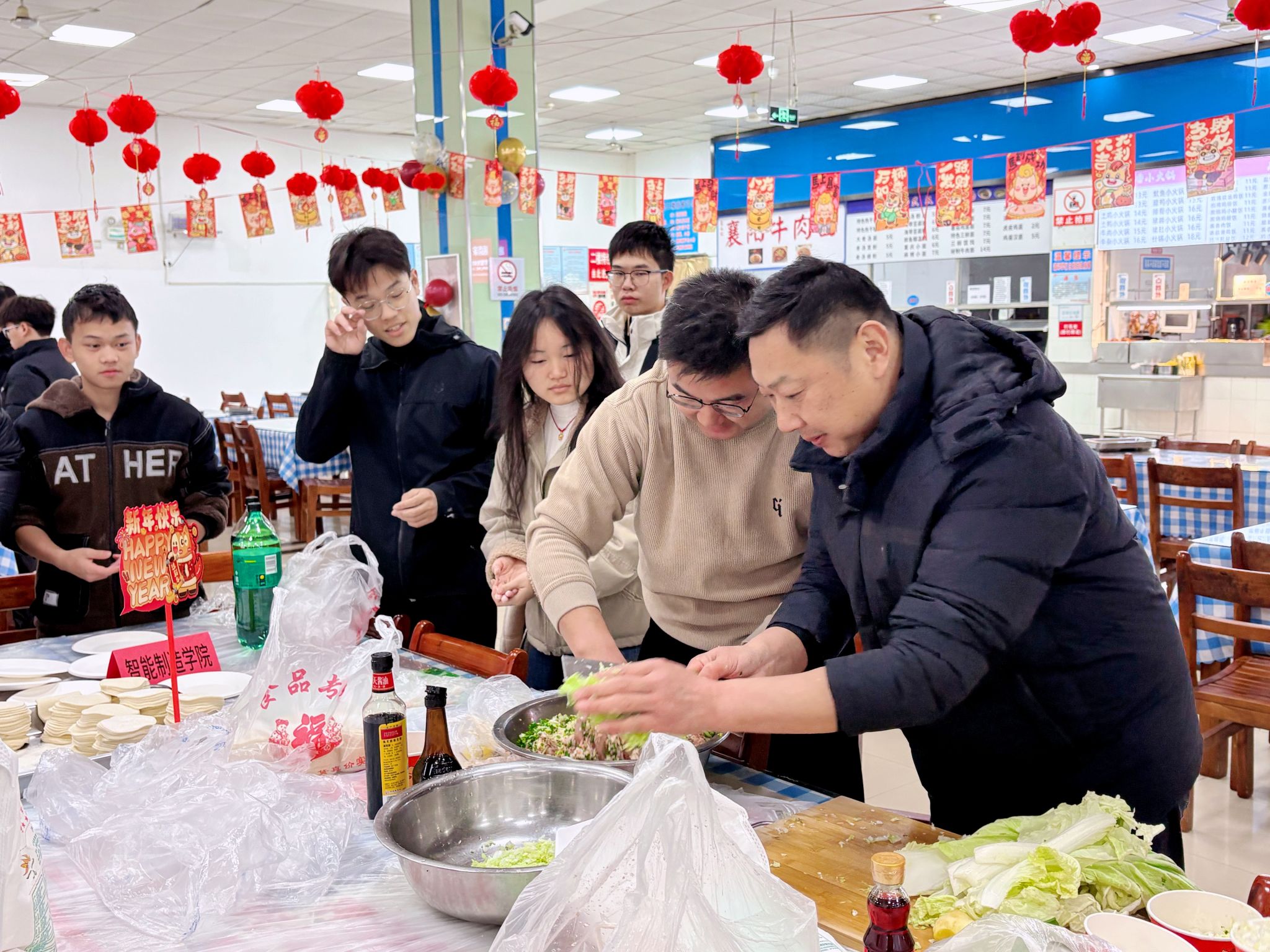 随后,师生们围坐在长桌旁,纷纷动手实践。有人左手托皮、右手舀馅,指尖轻巧一捏,一枚月牙形的饺子便跃然掌心;有人略显生疏,馅料不时从皮缝中溢出,引得周围笑声连连。原本平平无奇的饺子皮,在大家的巧思与热情中被捏成元宝、包子、柳叶等多种造型,桌面上很快摆满了形态各异、饱含心意的饺子。欢声笑语交织着面香肉香,整个食堂洋溢着浓浓的节日温情与团圆氛围。