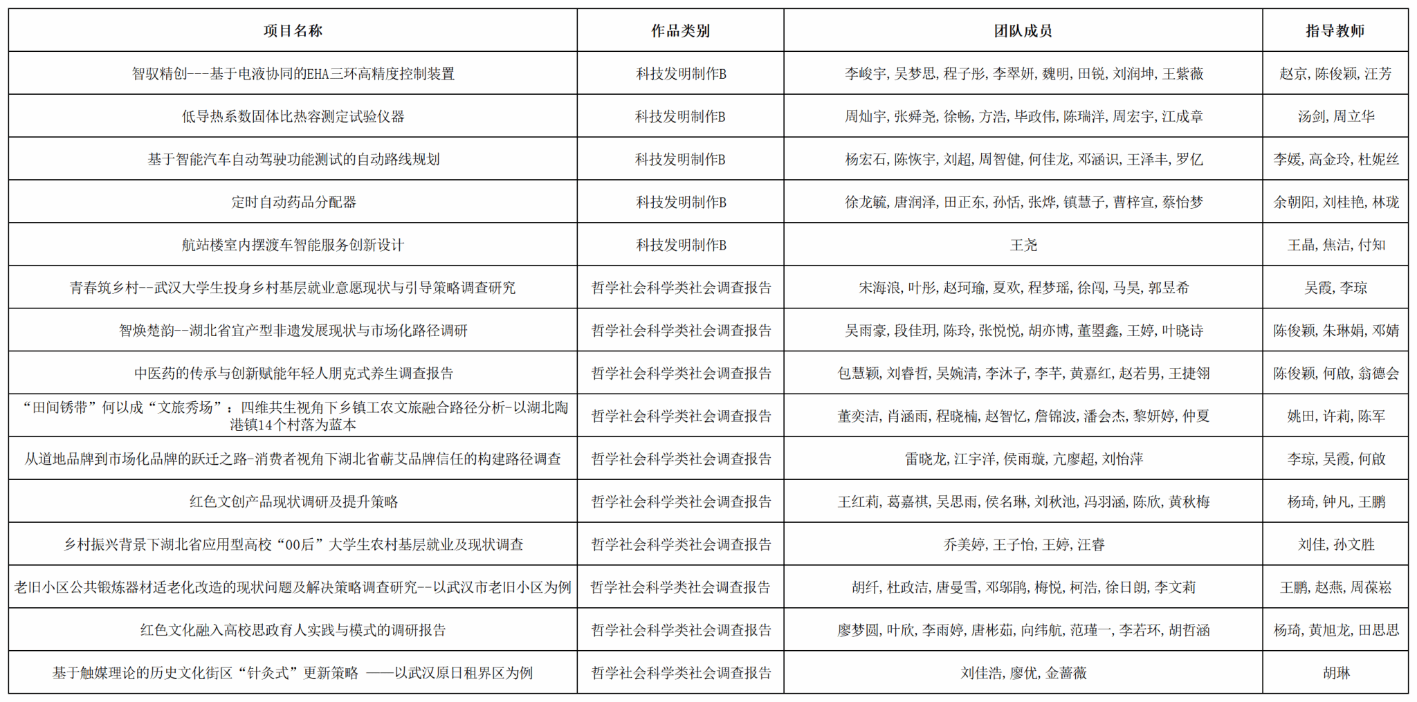 根据《关于组织开展“创新湖北·青力青为”湖北省第十五届“挑战杯”大学生课外学术科技作品竞赛的预通知》文件要求,经学院选拔、书面评审、校级决赛等环节,现对推荐代表学校参加湖北省第十五届“挑战杯”大学生课外学术科技作品竞赛的十五件作品进行公示,具体信息如下: