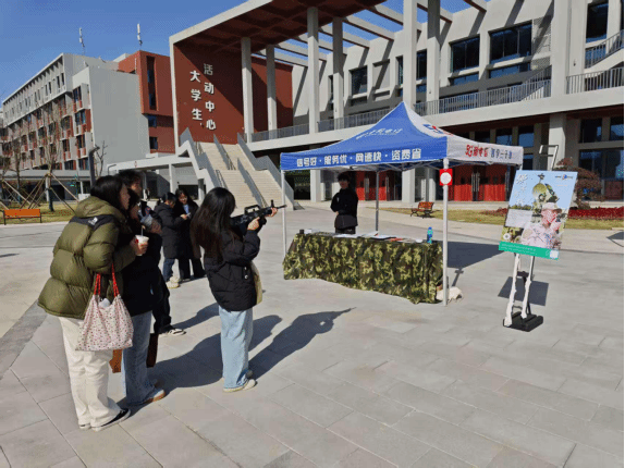 活动中,初之兵心社团充分发挥特色优势,全程统筹策划、精细执行,将国防宣传与社团特色深度融合。社团精心设计多元活动环节:特邀人员开展征兵政策宣讲,组织退伍军人分享军营故事,一对一为意向同学答疑;打造“枪林弹雨”“炸碉堡”趣味军事游戏区,策划国防知识问答,让学子在沉浸式体验中学习国防知识;同步在两校区布置征兵宣传海报,直观传递军营魅力。