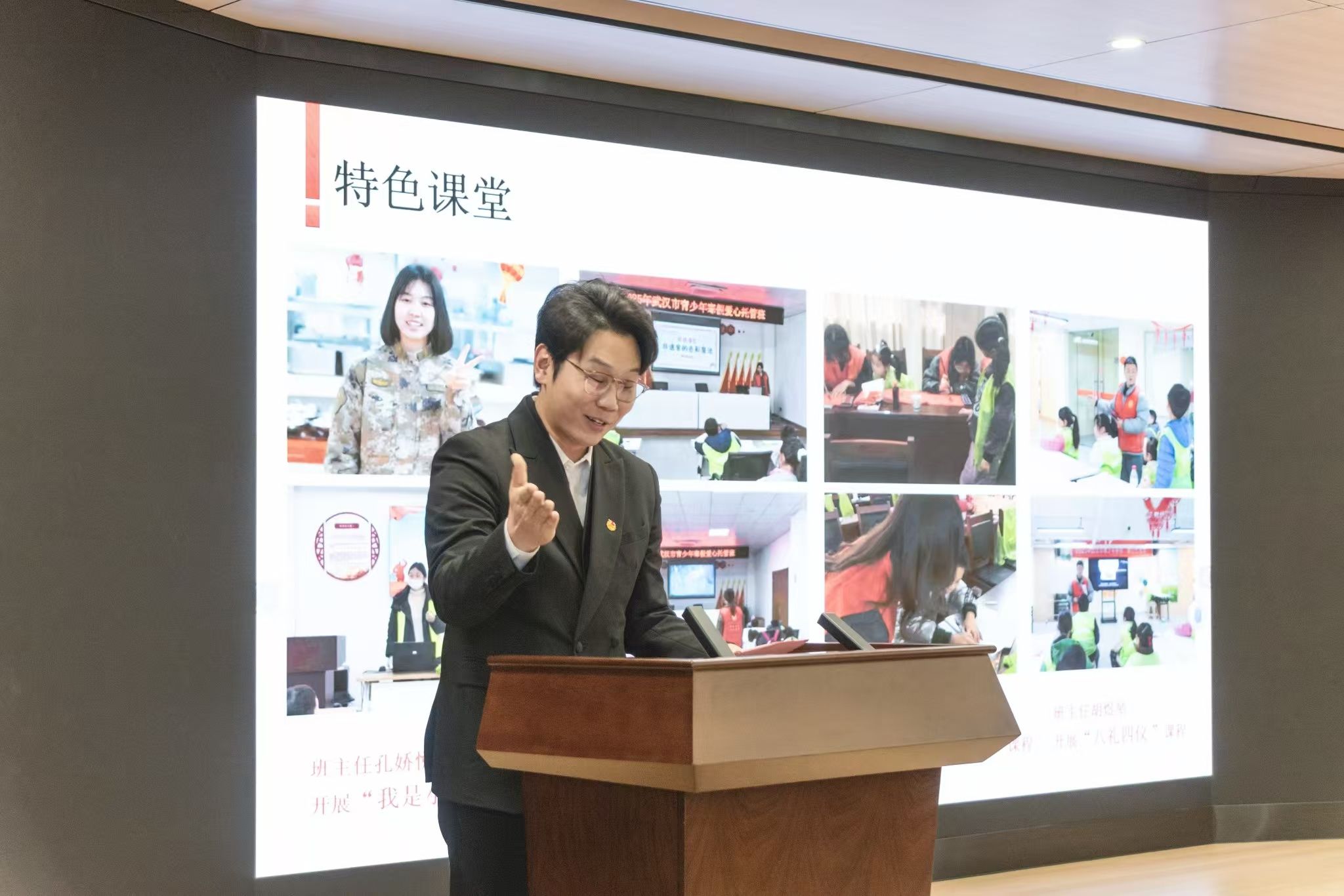 在分享会上,陈军老师代表助阳花开实践队,以“愿做绘制孩子七彩童年的‘陪伴者’”为主题,向包括团市委、市城管委、市疾病预防控制中心、武汉血液中心等在内的多位领导及青年志愿者们分享了学校寒假“爱心托管班”的宝贵经验。他详细介绍了从志愿者招募到培训,再到服务实施的全过程,并强调了精细化管理和服务创新的重要性。陈军老师的分享赢得了现场观众的热烈掌声和高度评价。