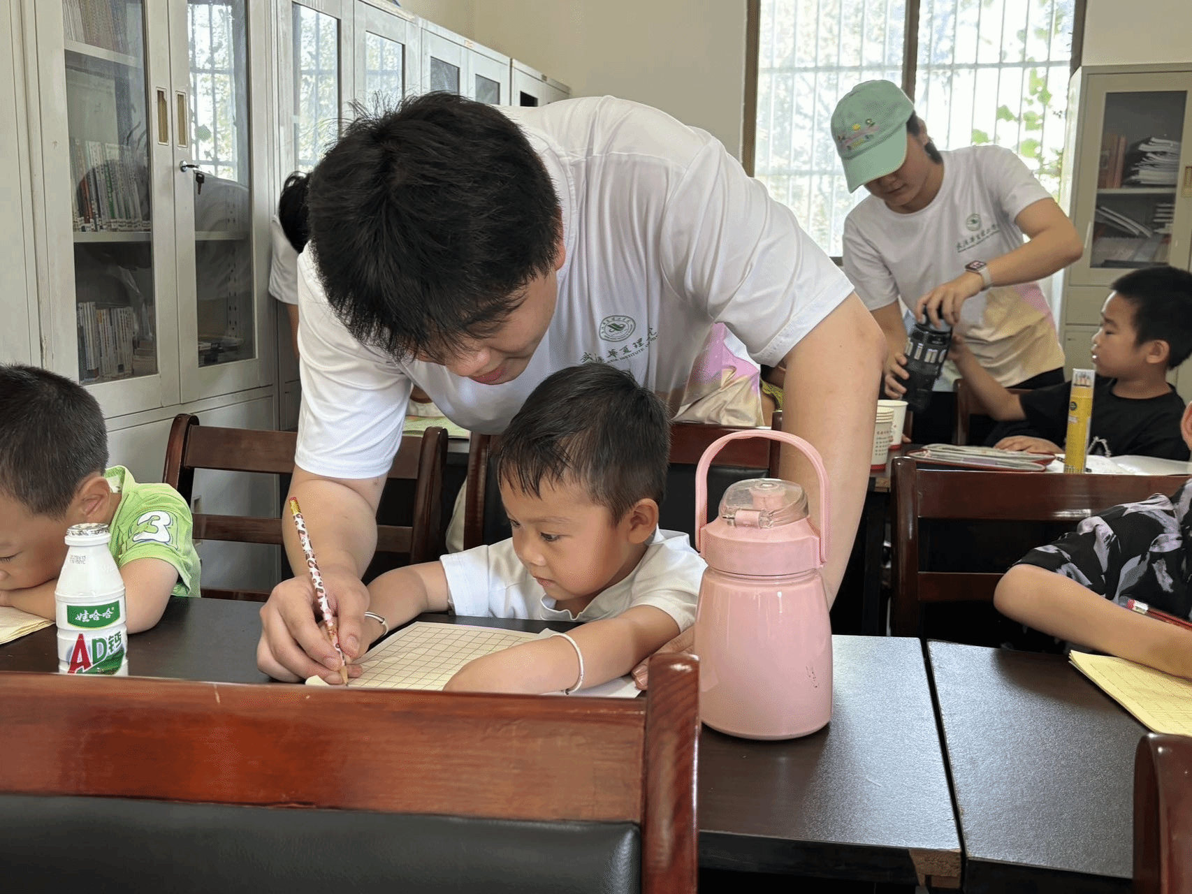 下午,实践队针对不同班级开展差异化教学。对于有暑假作业的大班孩子,志愿者们耐心辅导,逐题讲解,帮助他们攻克学习难点;小班课堂则采用学玩结合的方式,孩子们在完成写字练习后,就可以适当放松一会,让孩子们在学习过程中循序渐进,不觉乏味。