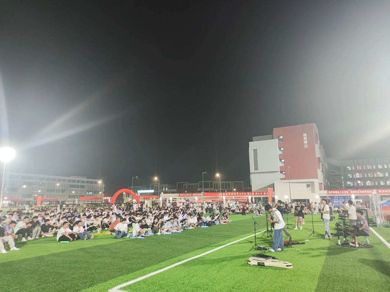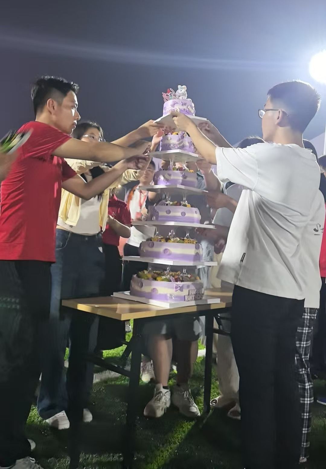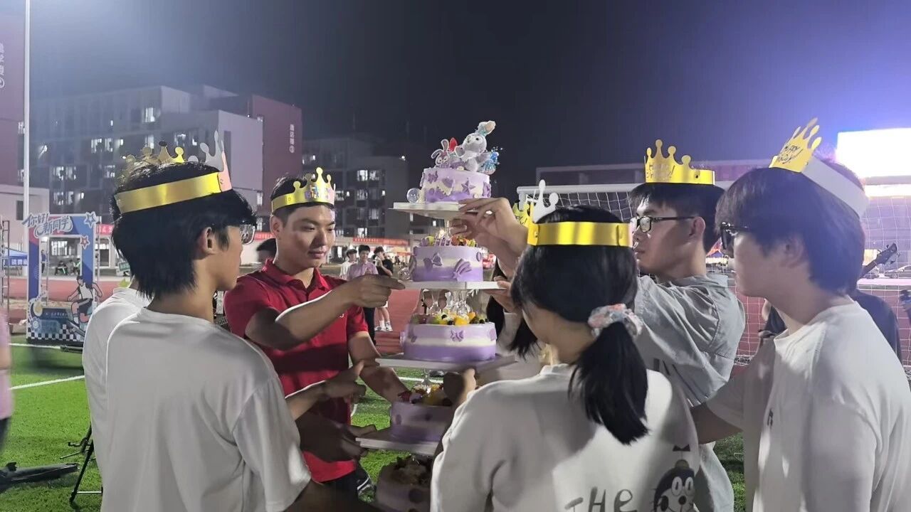 夜幕降临,操场灯串闪烁,温情流淌。9月13日晚,一场露天草坪音乐会在梧桐湖校区温情上演。校团委特邀校友乐队“傍晚乐队”登台献唱,用青春旋律唤醒新生对大学生活的无限憧憬。演出中,大屏幕突然亮起“萌新·生日快乐”字样,惊喜开启集体生日会。6层蛋糕缓缓推出,烛光摇曳,师生齐唱生日歌,为9月13日-14日过生日的新生送上祝福。许愿、吹蜡烛、合影留念,笑声与感动交织,让离家后的第一个生日,充满“家”的温暖。