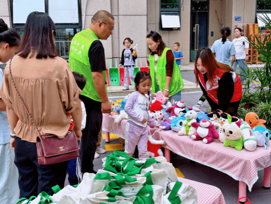 活动现场,大学生志愿者身着红马甲,忙碌地协助引导小朋友排队、参与游戏,还帮工作人员分发奖品,身影穿梭在活动各个角落。